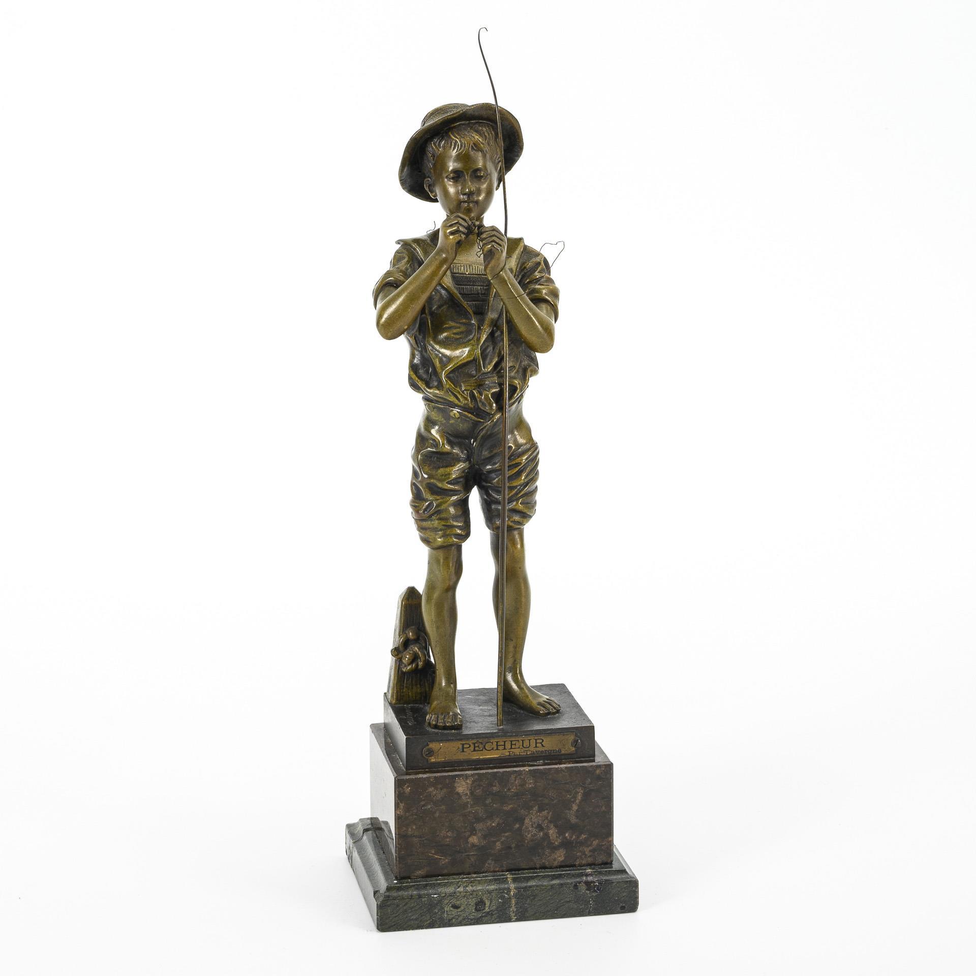 Bronze patinated, brown and green serpentine base. Inscribed, titled/inscribed on the bronze plinth: "Pecheur / par Lavergne". H 29.5 / 36.5 cm (without tang). 3.4 kg.