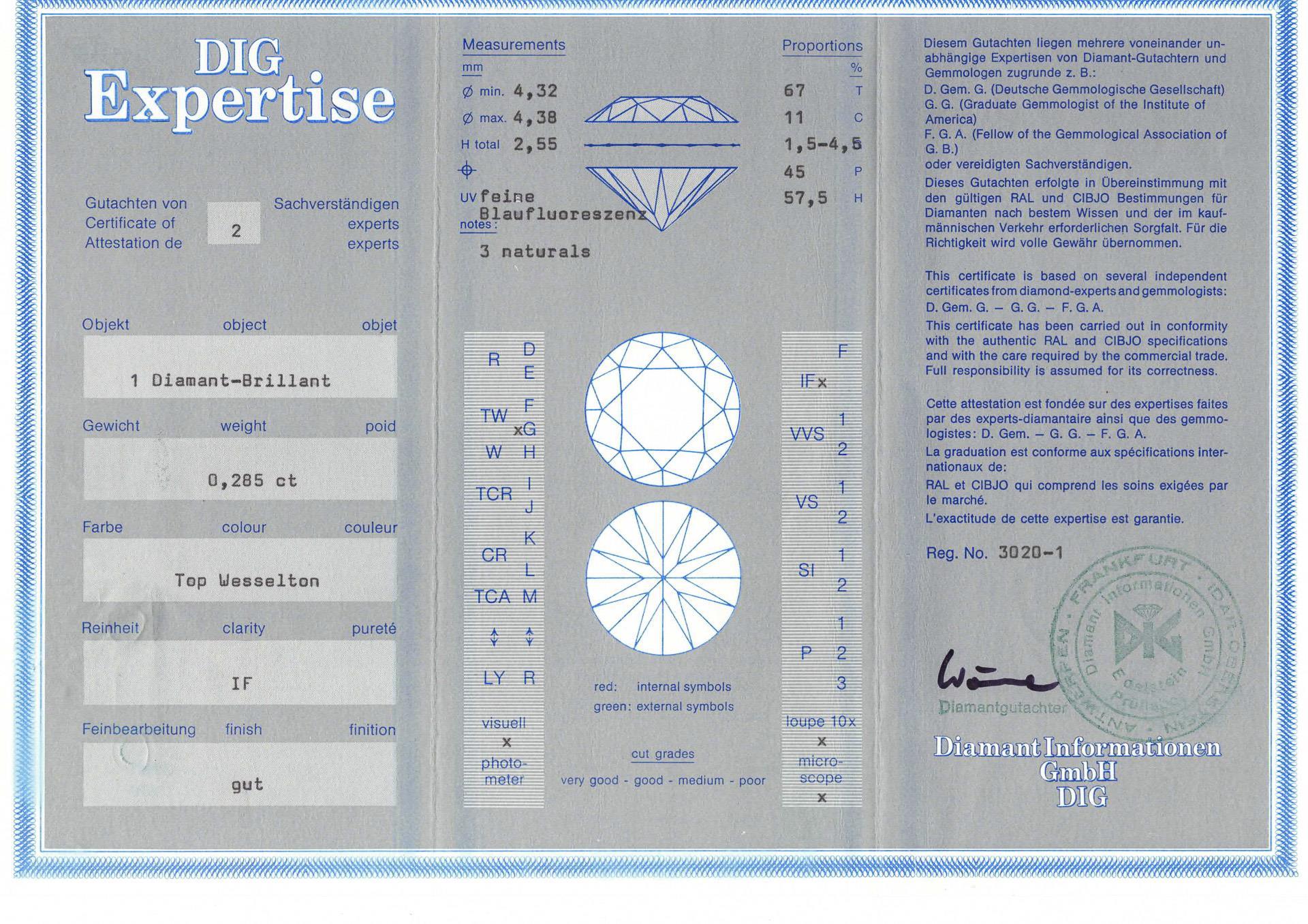Brilliant of 0.285 ct, fine white, IF (free of internal features), fine finish good. Sealed in plastic cover. Registration no. 3020-1 from: Diamant Informationen FmbH (DIG), Frankfurt a Main.