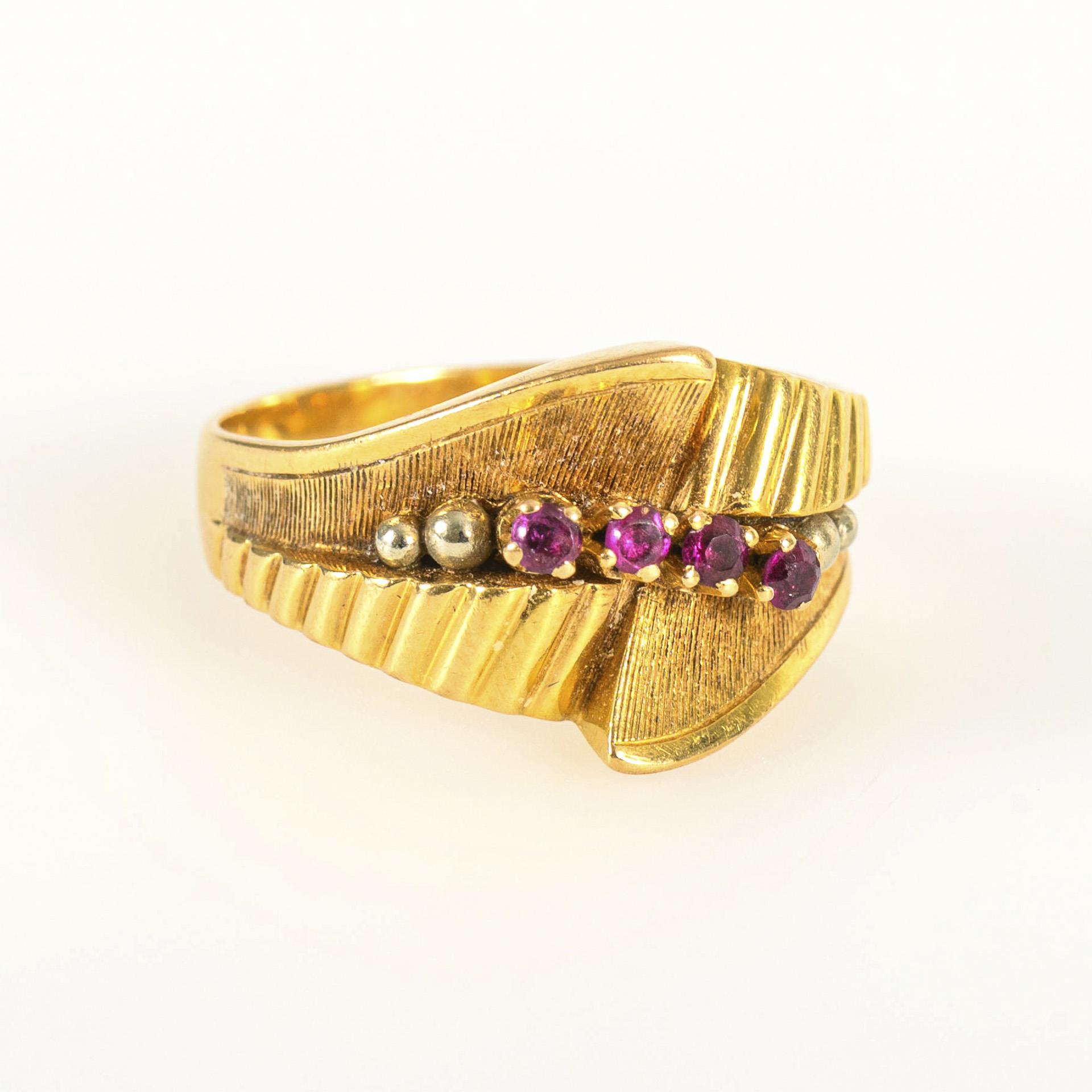 Large, dynamically designed ring with 4 red, chaton-set stones on a wide shank.