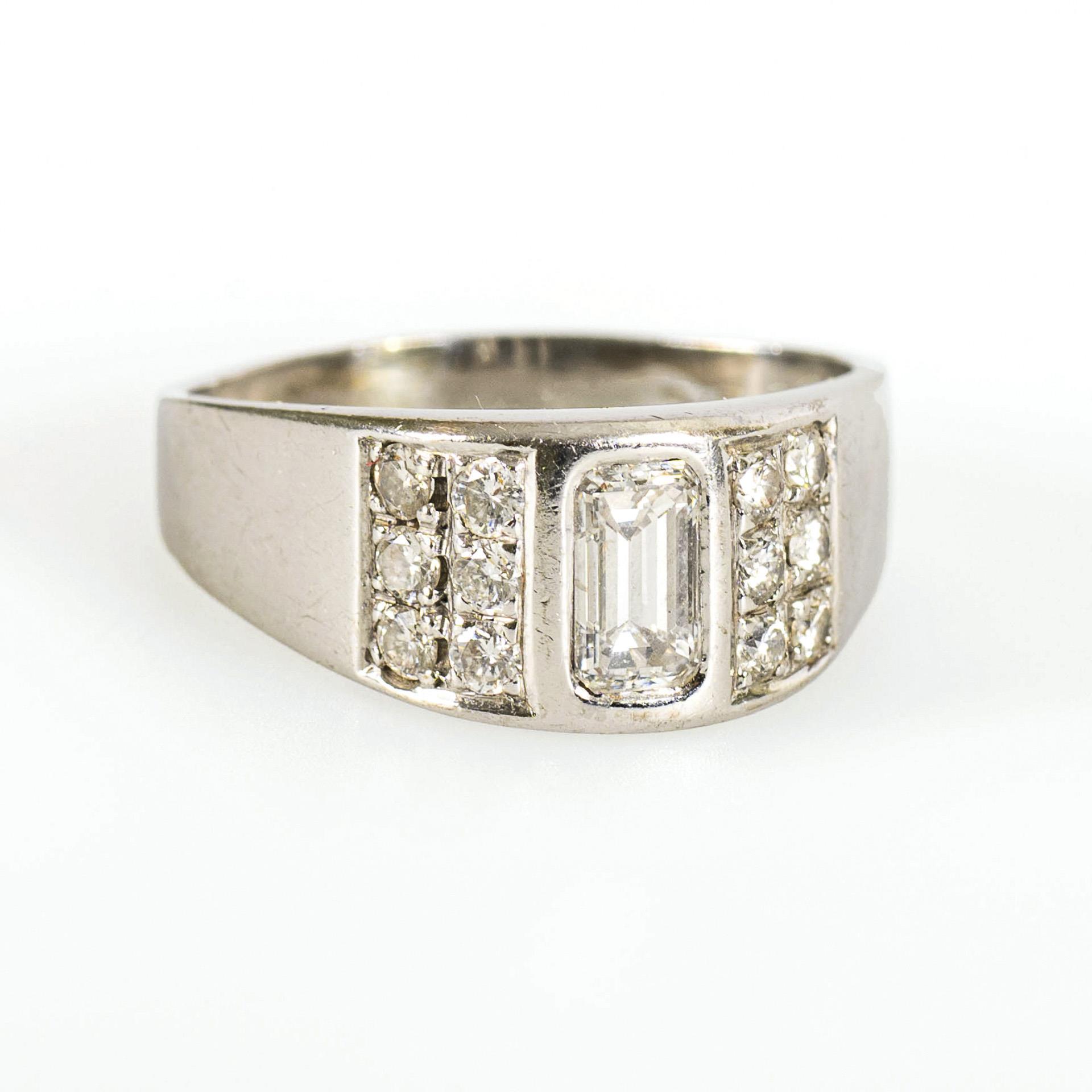 Stamped 750 white gold. Center stone approx. 3.5 x 7 mm. Ring size 59.5. 6.7 g.