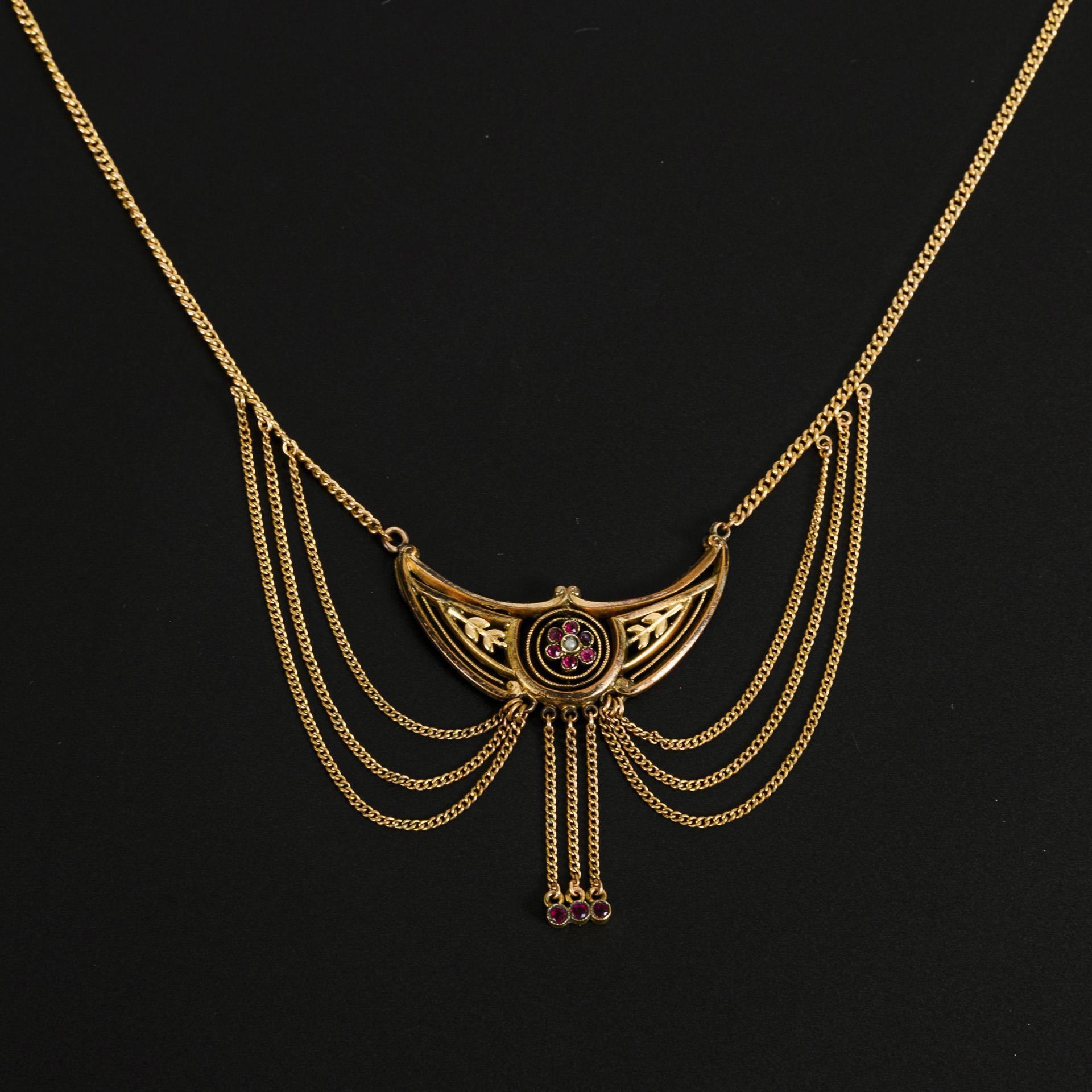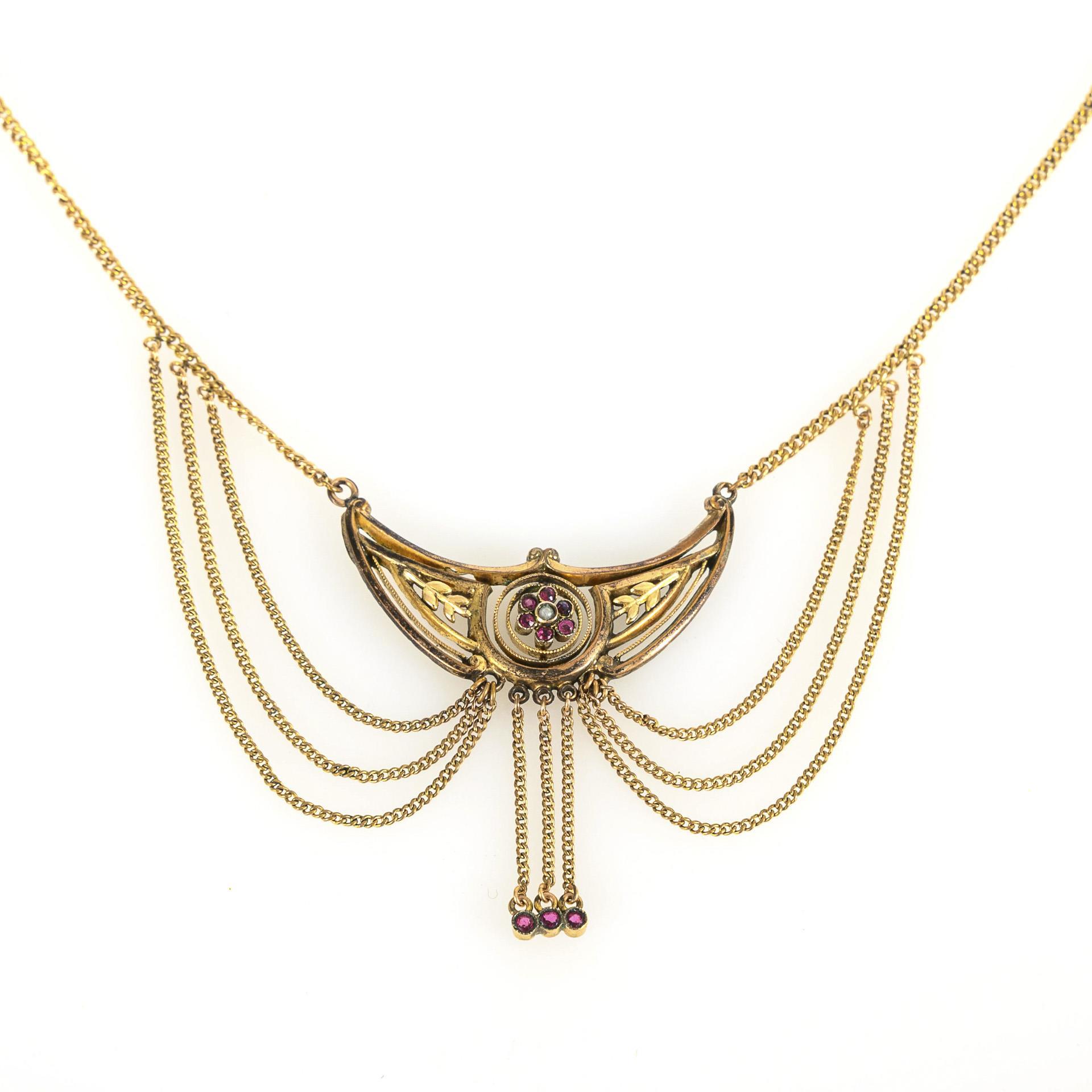 Delicate Art Nouveau necklace with pendants, gemstones and seed pearl, typical of the period. Gilding partially rubbed, an older repair.