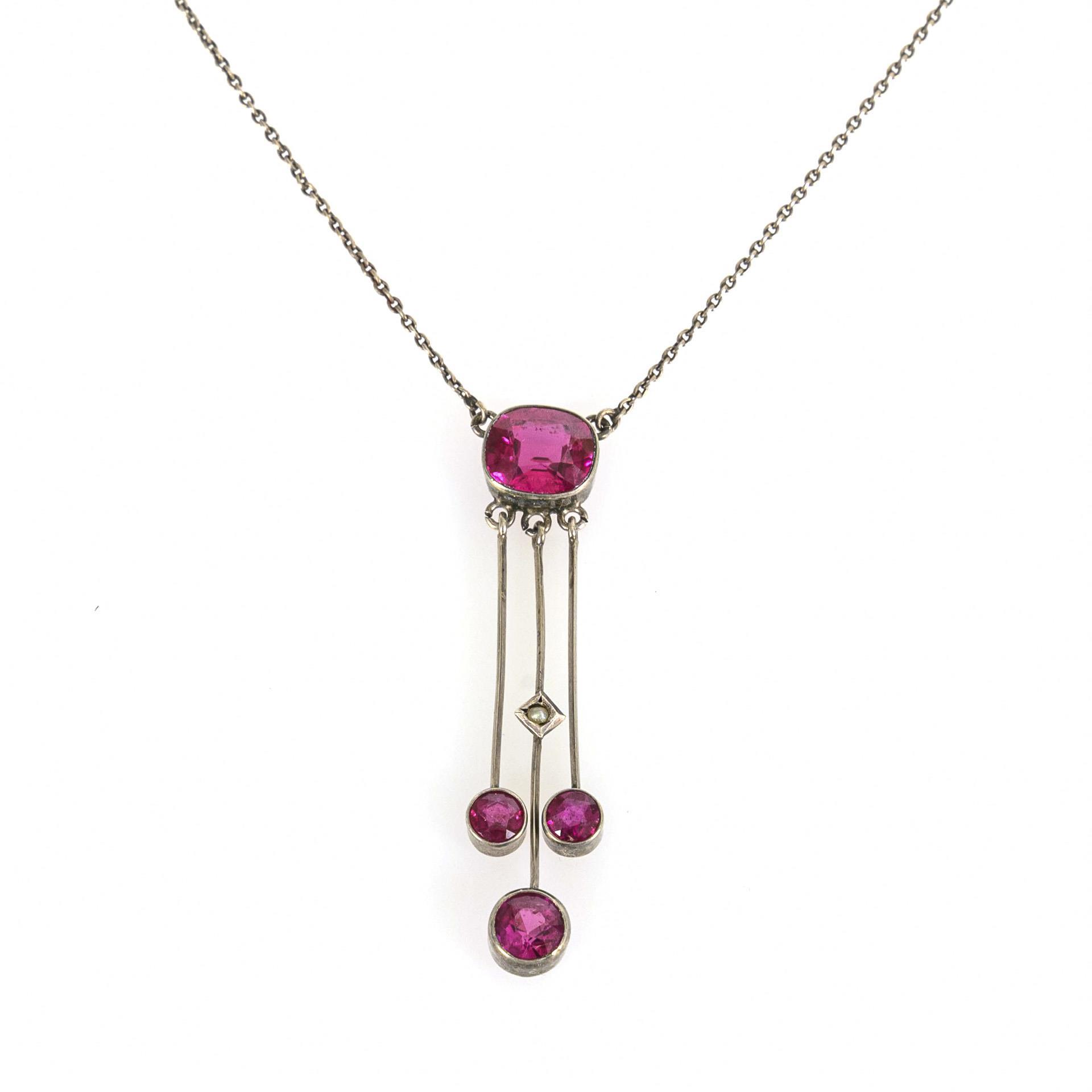 Art Nouveau lavallière necklace in silver, probably with almandine garnets, a halved seed pearl and suspensions.