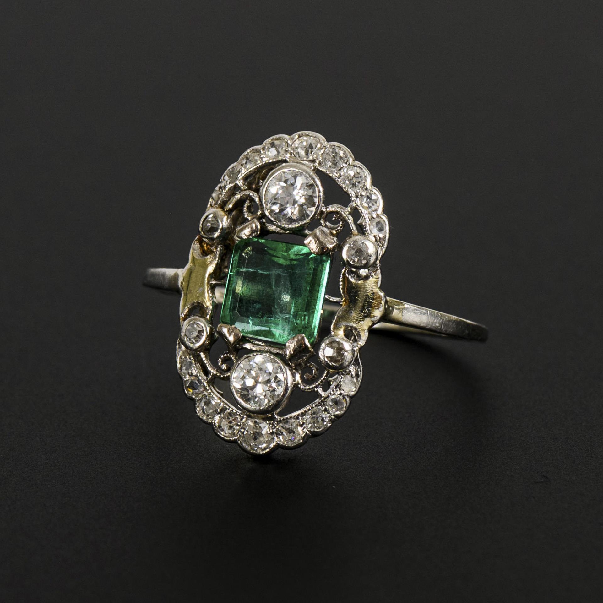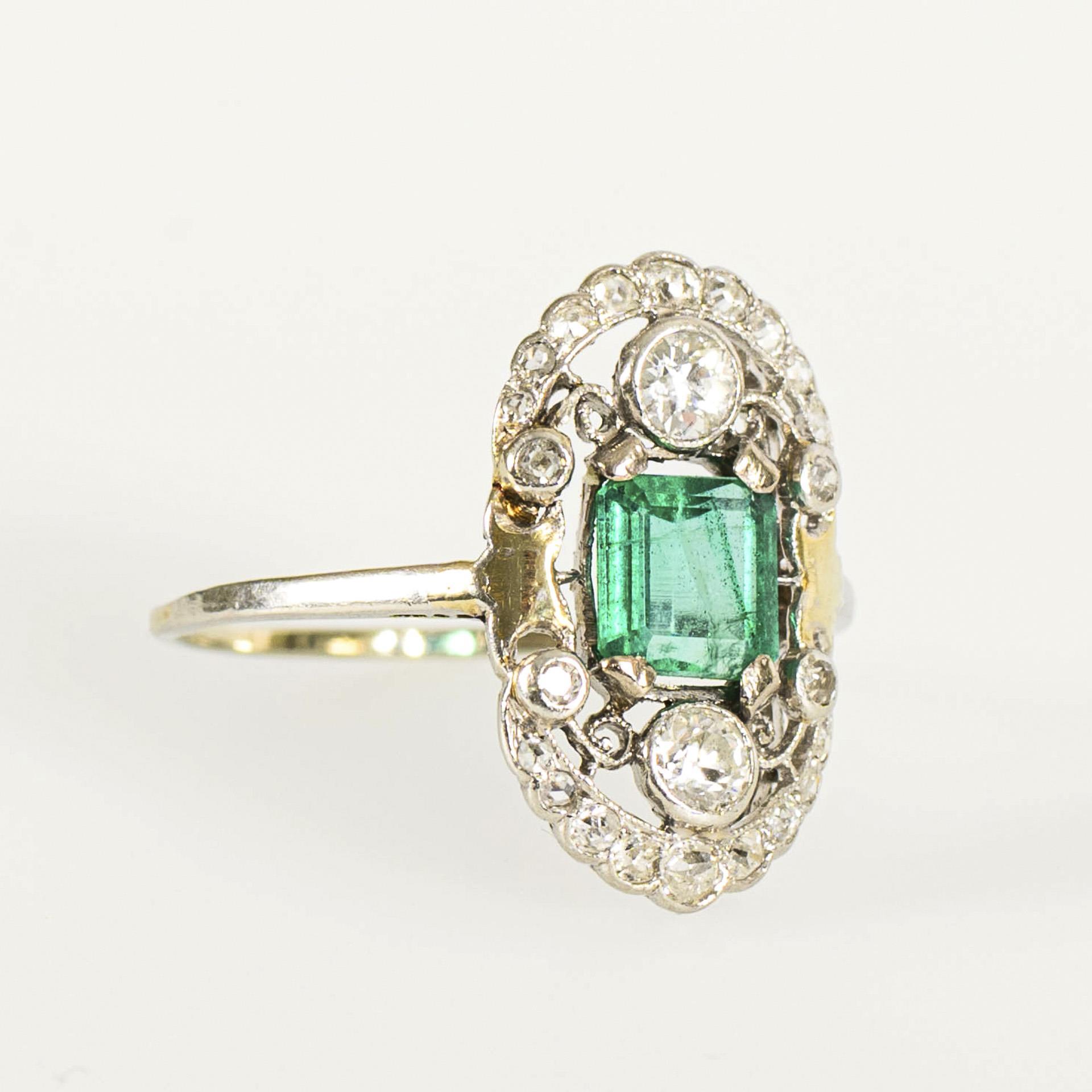 Art deco ring with emerald, old-cut diamonds and brilliant-cut diamonds.