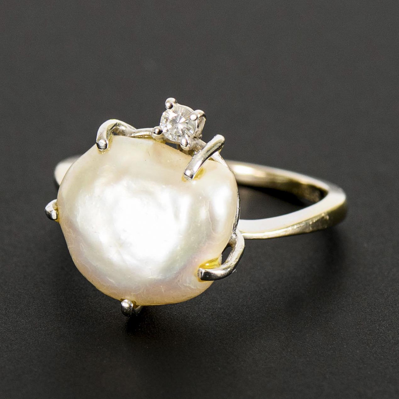Large baroque pearl and brilliant-cut diamond in chaton setting, on delicate ring shank. Slight signs of wear to the pearl due to use.