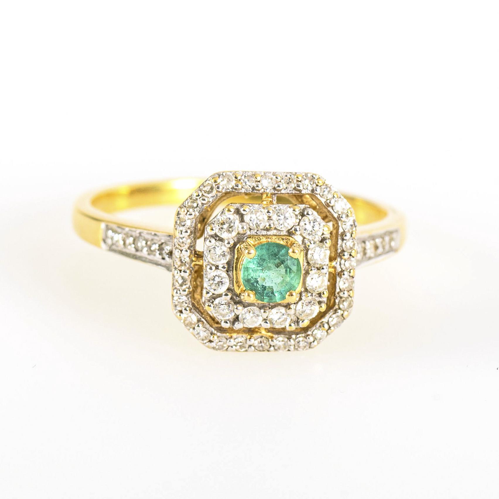 Yellow gold ring with diamonds and green stone.
