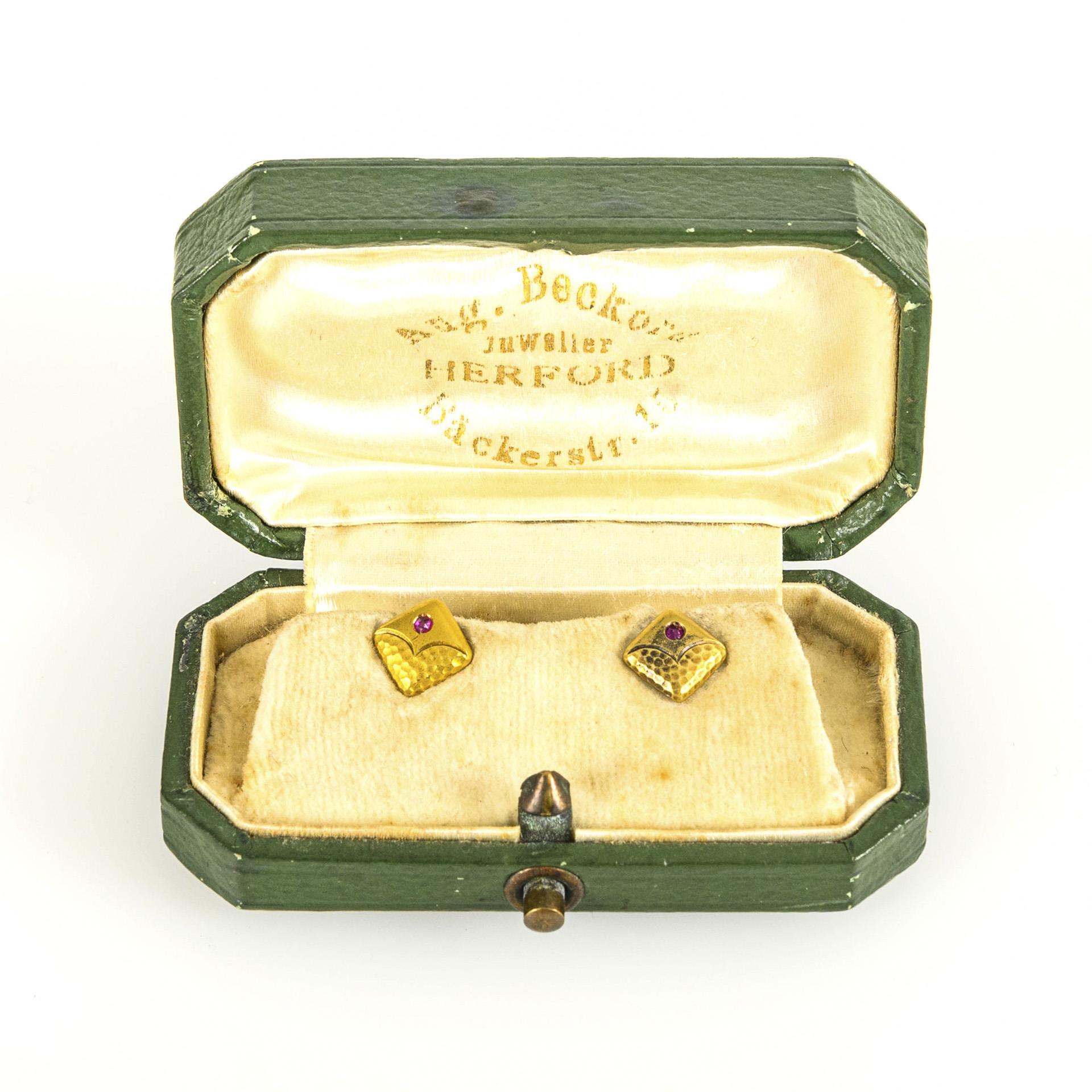 2 small, partially reliefed buttons with red colored stone on toggle, in green case "Aug. Beckord Juwelier HERFORD Beckerstr. 15".