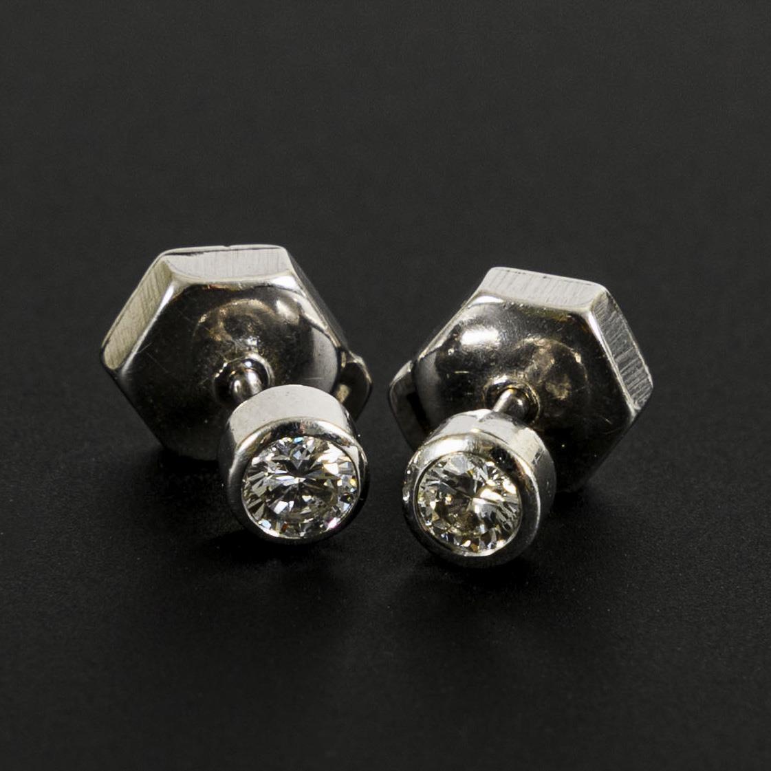 Modern pair of stud earrings with bezel-set diamonds.