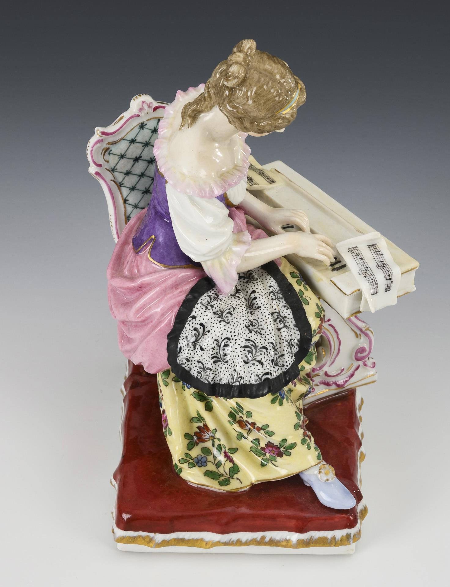 Sitting rococo lady playing a spinet. 1 sheet of music restored.