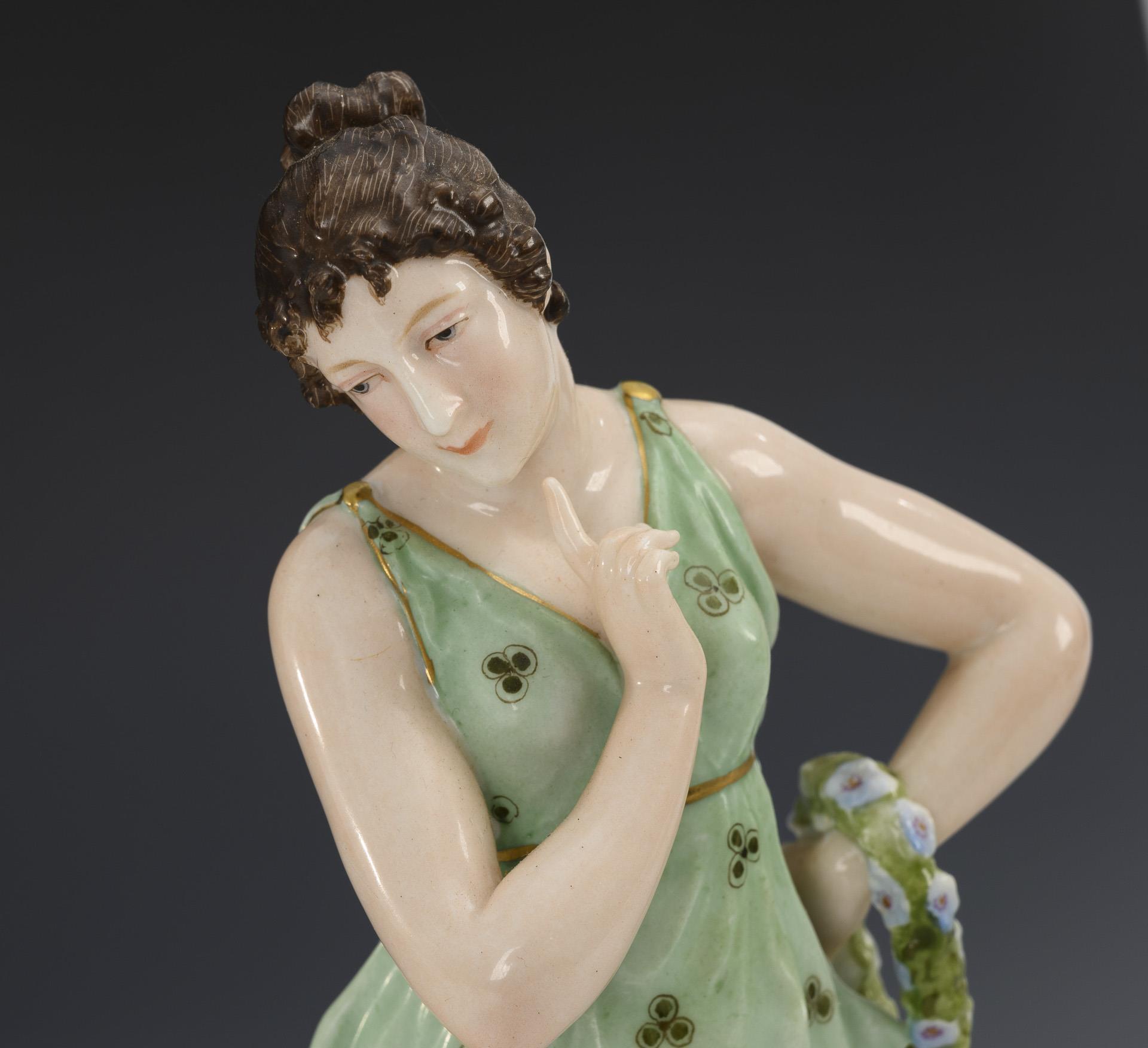 Lady standing on a round base, wearing a wreath of flowers on her left wrist. Gold somewhat rubbed.