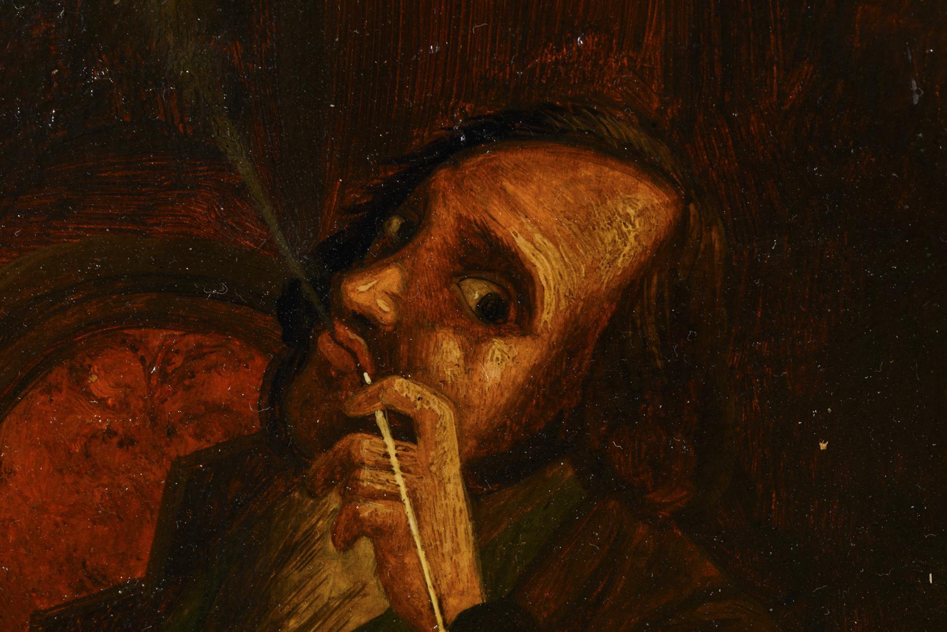 Two men at a table with playing cards and long-stemmed pipes, by candlelight. Slight traces of age.