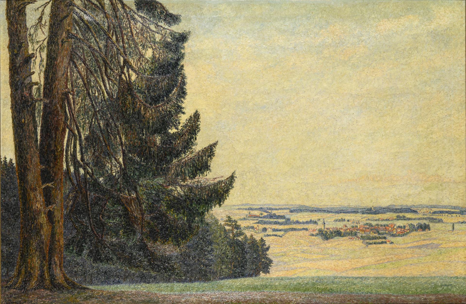 Edge of the forest with a view over the wide hilly landscape with the villages in the sunshine.