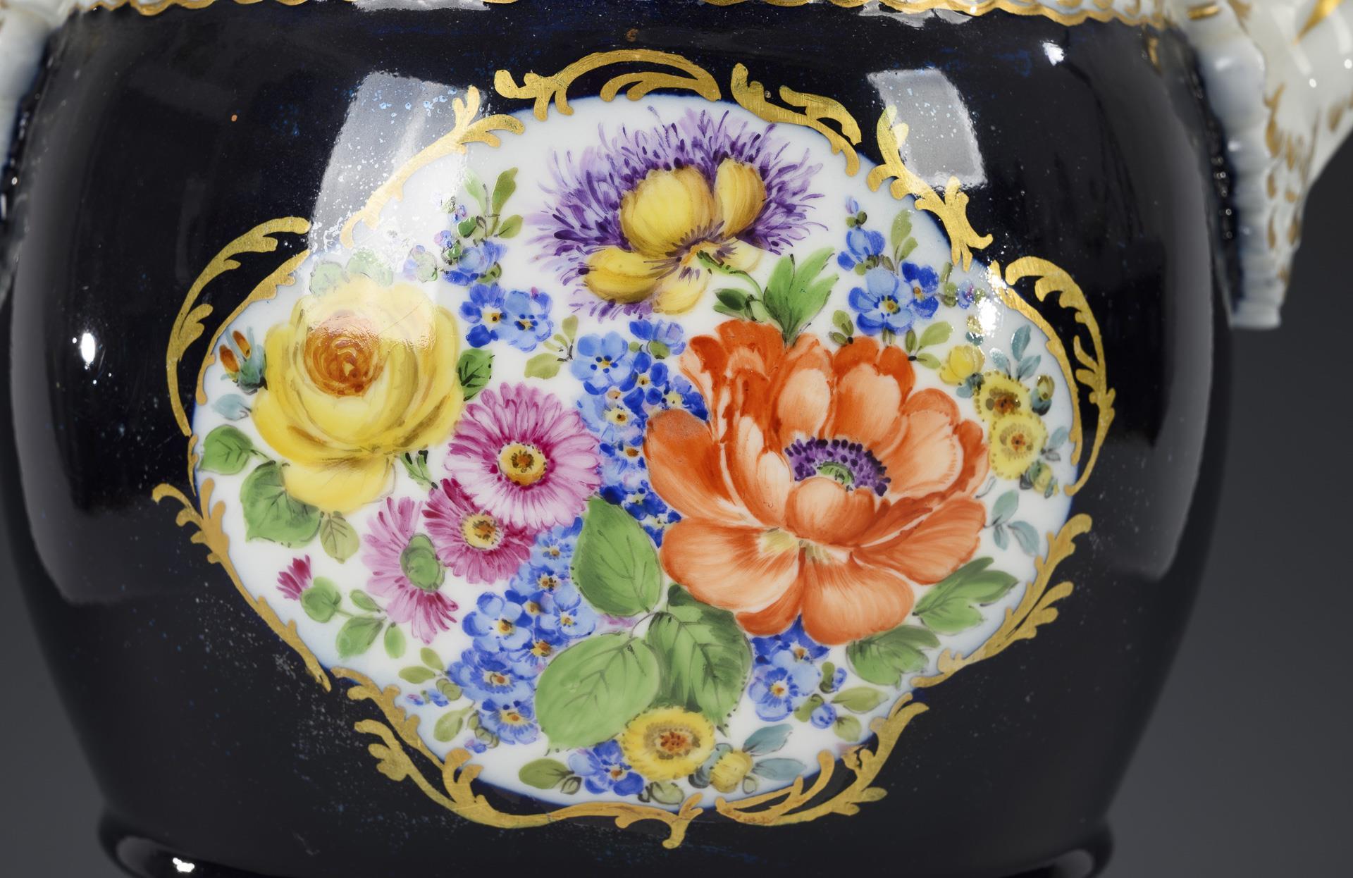 Snake-handled vase with cobalt ground and floral painting. Meissen.