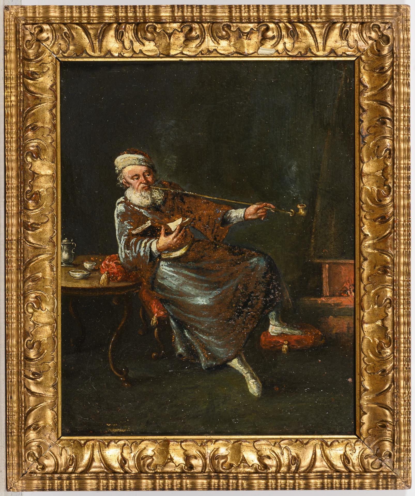 Genre scene with an elderly man at a table in a nightgown with a long-stemmed pipe. Minimal traces of age.