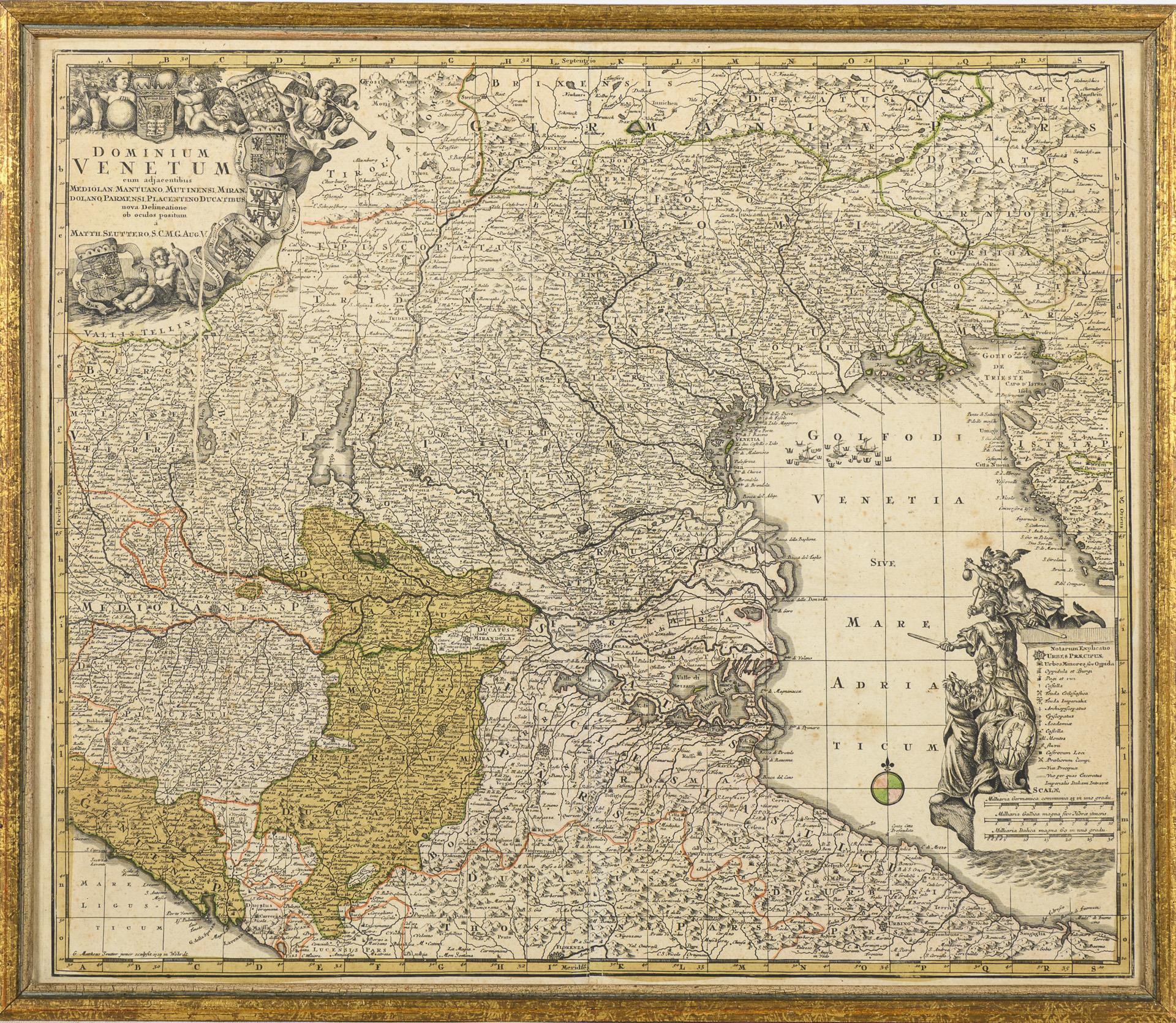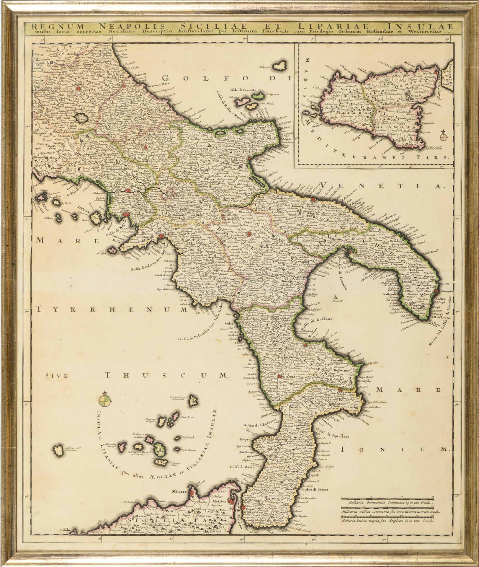 Matth. Seutter: "Dominium Venetum", (framed 54 x 63 cm) / Danckert: "Regnum Neapolis Sicilae et Liparia insulae", (framed 62 x 52 cm). Both slightly stained, 1x with pressure crease.