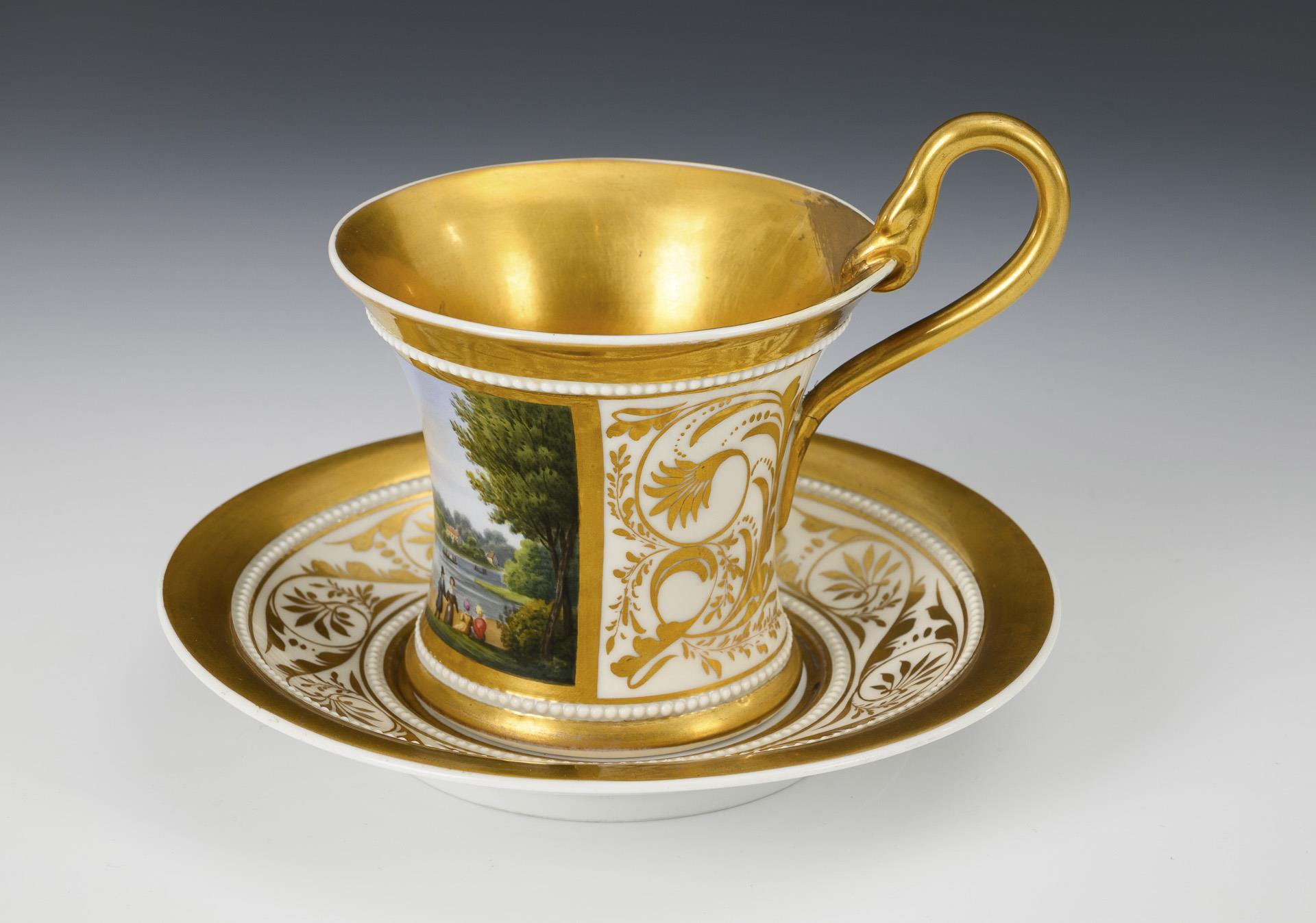 Polychrome painted, decorated in gold. Cup (h 10.5 cm), original saucer (Ø 16 cm).