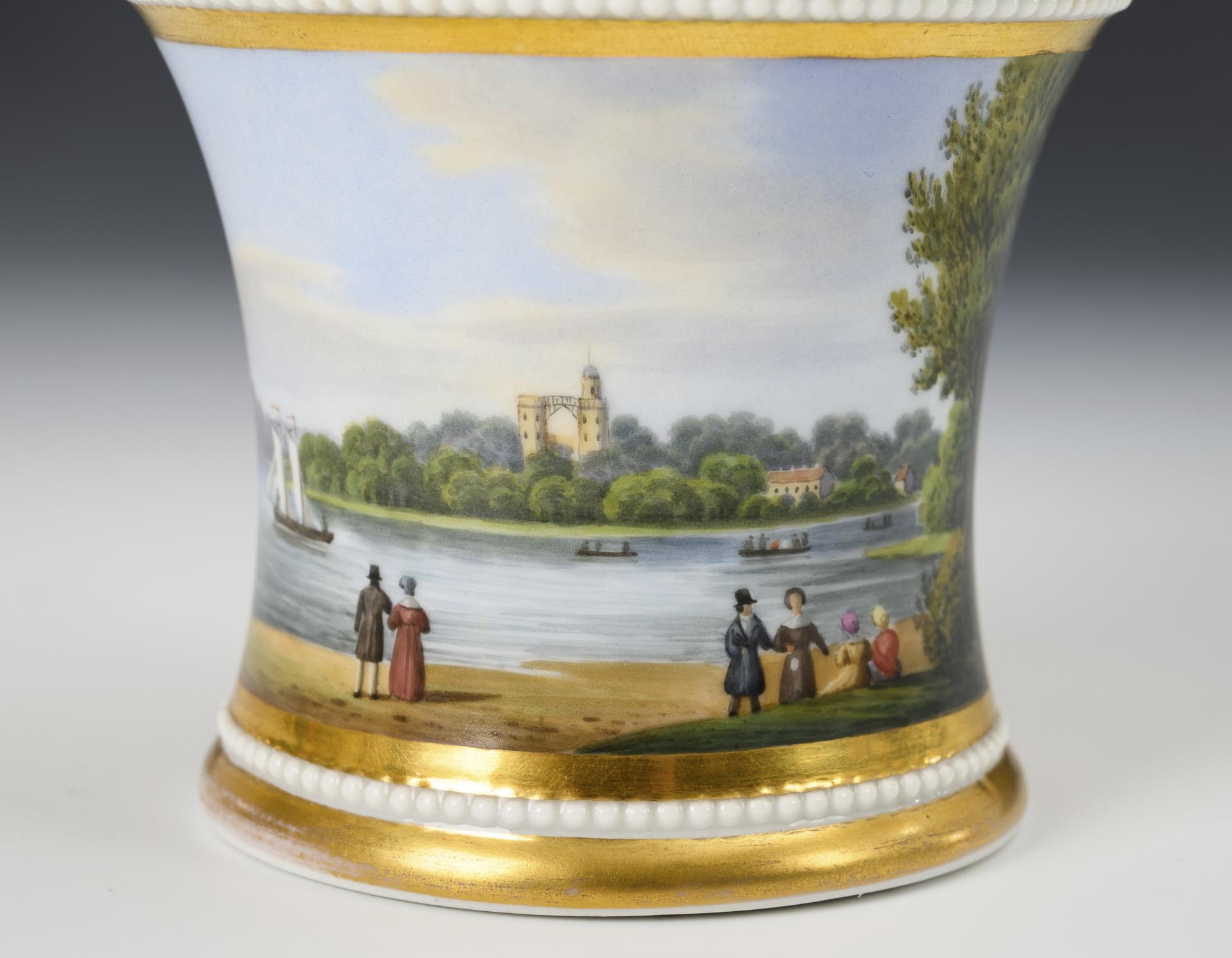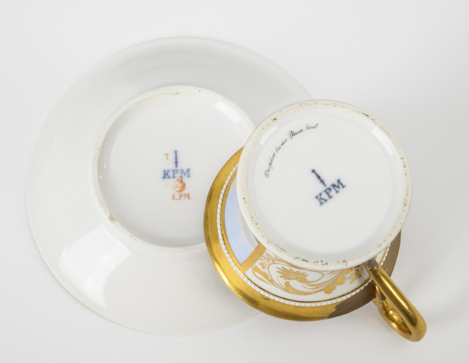 Cratered cup with pearl bands and swan handle. On the front a gold-framed rectangular cartouche with the depiction of the Peacock Island in Berlin inscribed on the underside, verso vegetal gold painting. Cup handle and part of the mouth rim restored.