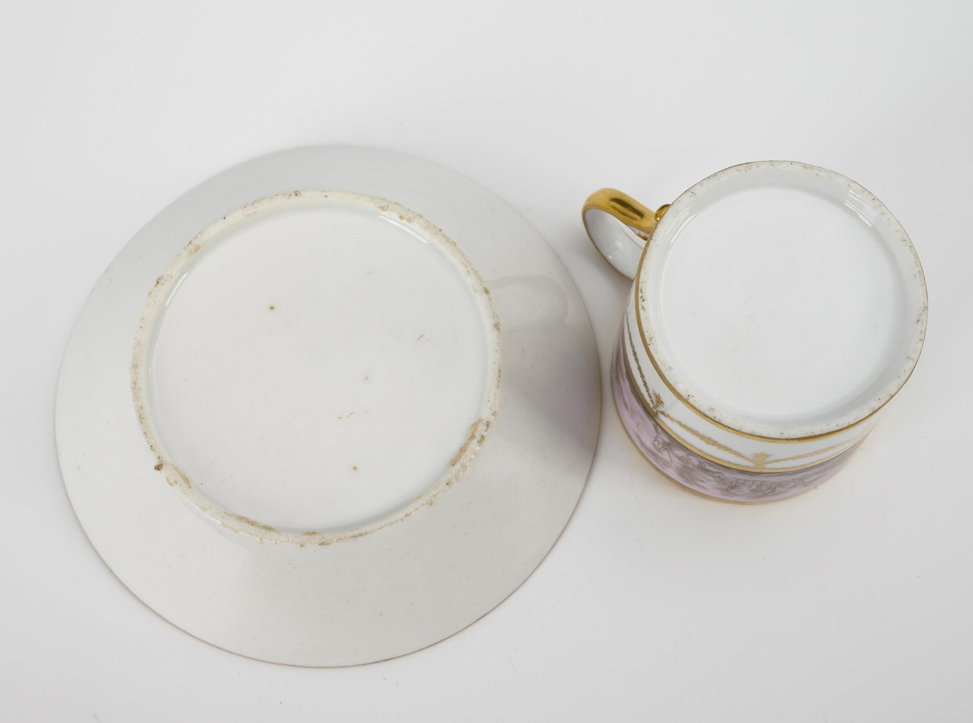 Polychrome painted, decorated in gold. Cup (h 6.5 cm), original saucer (Ø 13 cm).