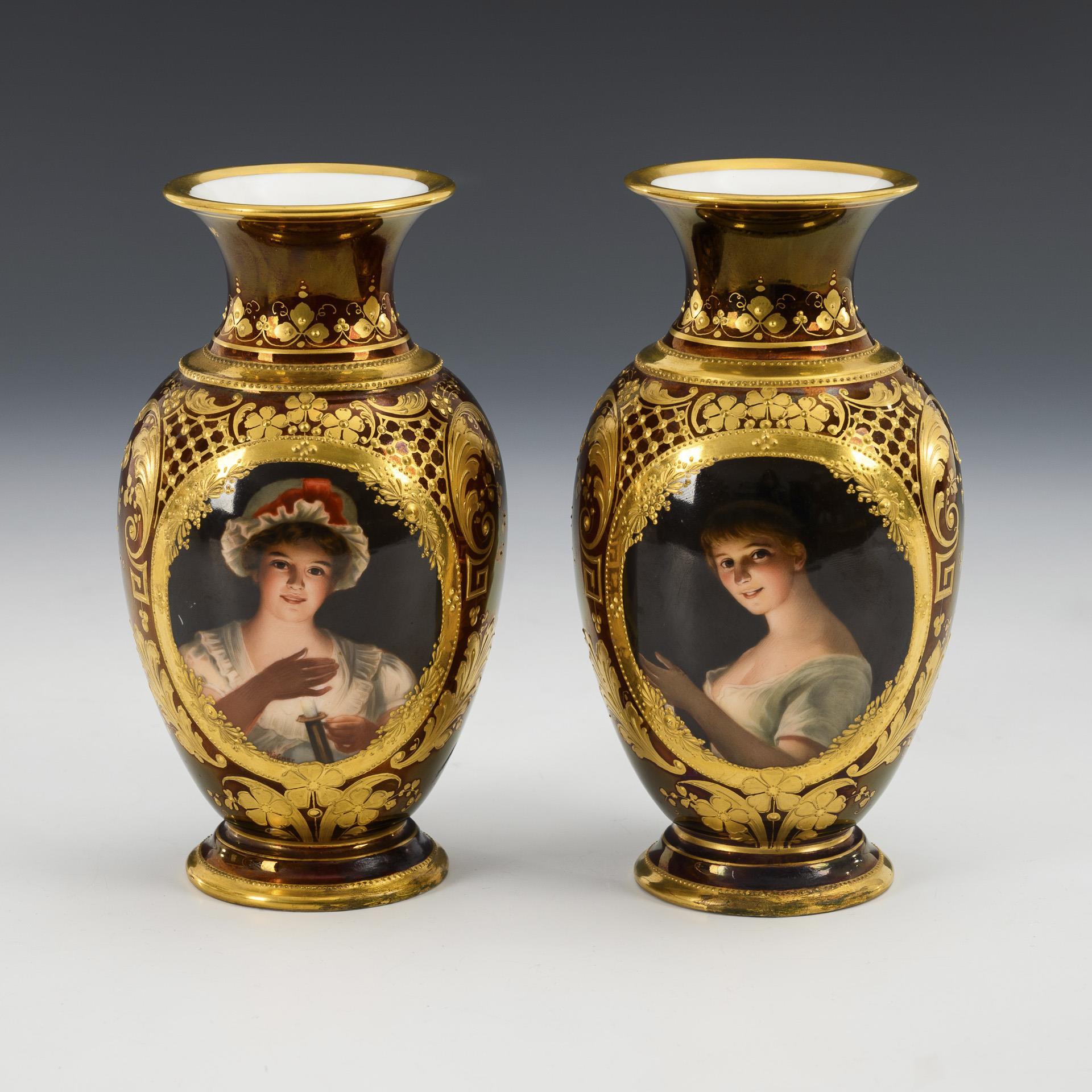 Baluster vases with crater neck and round base. Brown, lustrous base with fine floral and ornamental relief gold painting. On the front an oval cartouche with two different portraits of a lady with a night light, after the paintings "Gute Nacht" and "Lisette" by Georg Horn (1838-1911), inscribed on the underside. Both feet restored.