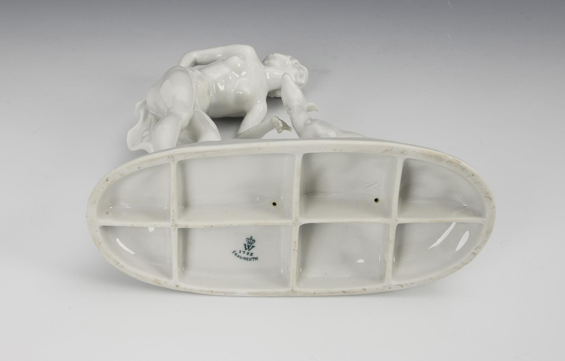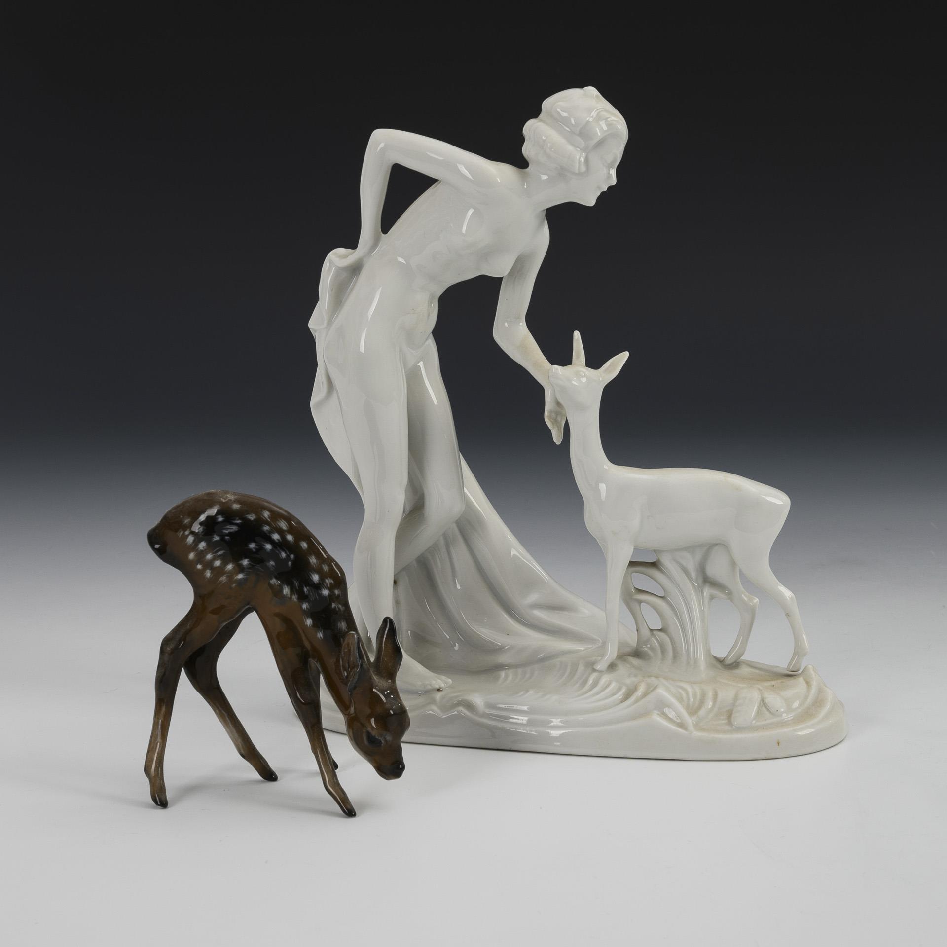 1x WALLENDORF, mark with addition Fraureuth, 1916/32-1956: Nude of a young woman, bending towards a deer (H 20.5 cm, L 17.5 cm). / 1x ROSENTHAL, 2nd half 20th century: small figure of a grazing fawn (H 9 cm).