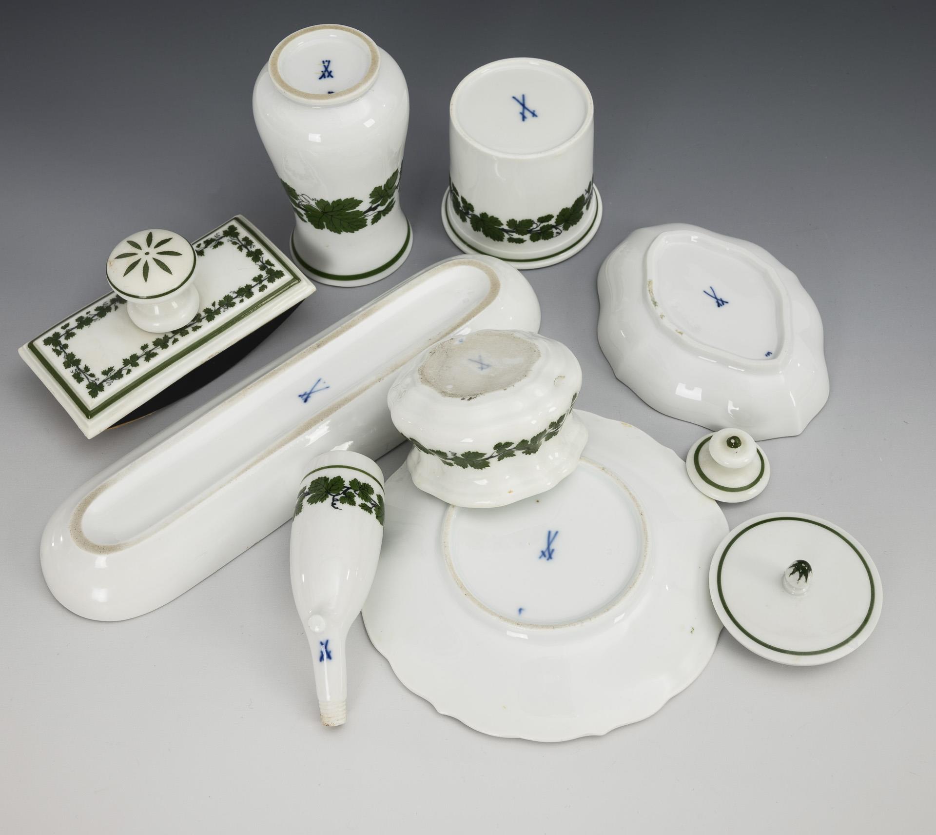 Feather bowl (L 23.5 cm), saucer (Ø 14.5 cm), blotting cradle (L 11 cm), inkwell (H 5 cm), cylinder box (H 7.5 cm), pipe bowl (L 10 cm), quatrefoil bowl (L 12.5 cm) and vase (H 10 cm). Chip on the edge of the lid of the cylinder box.
