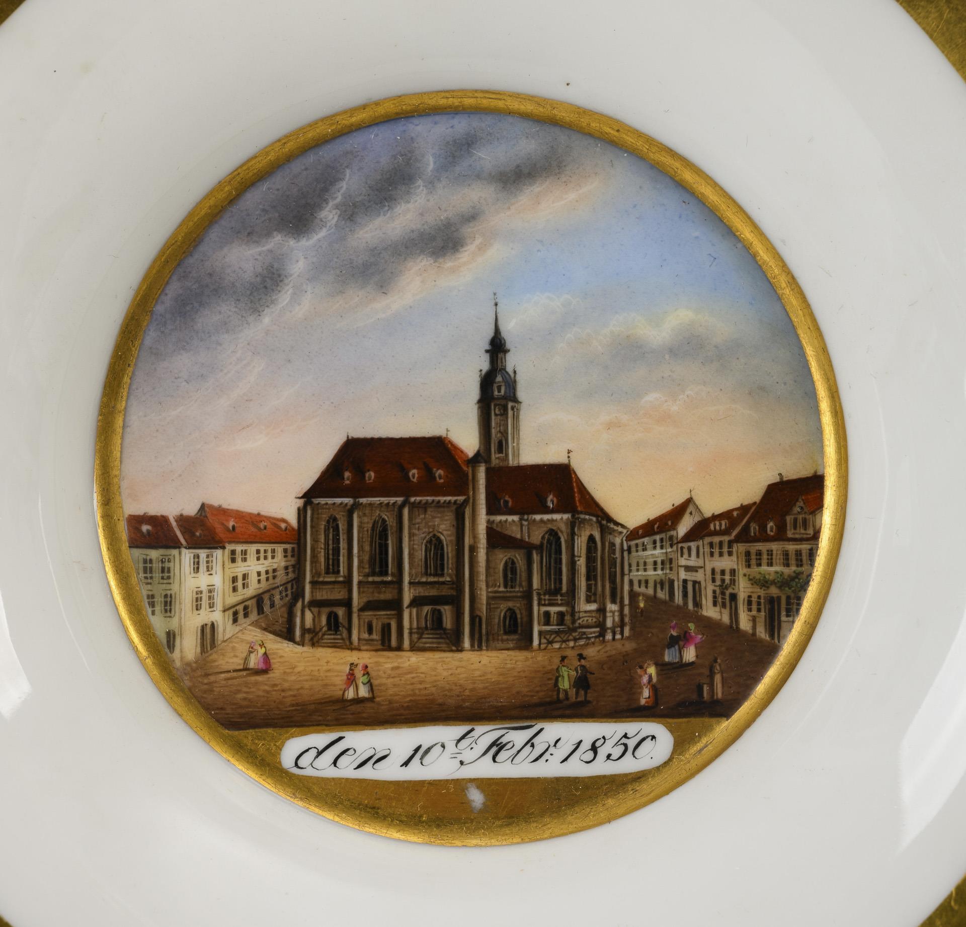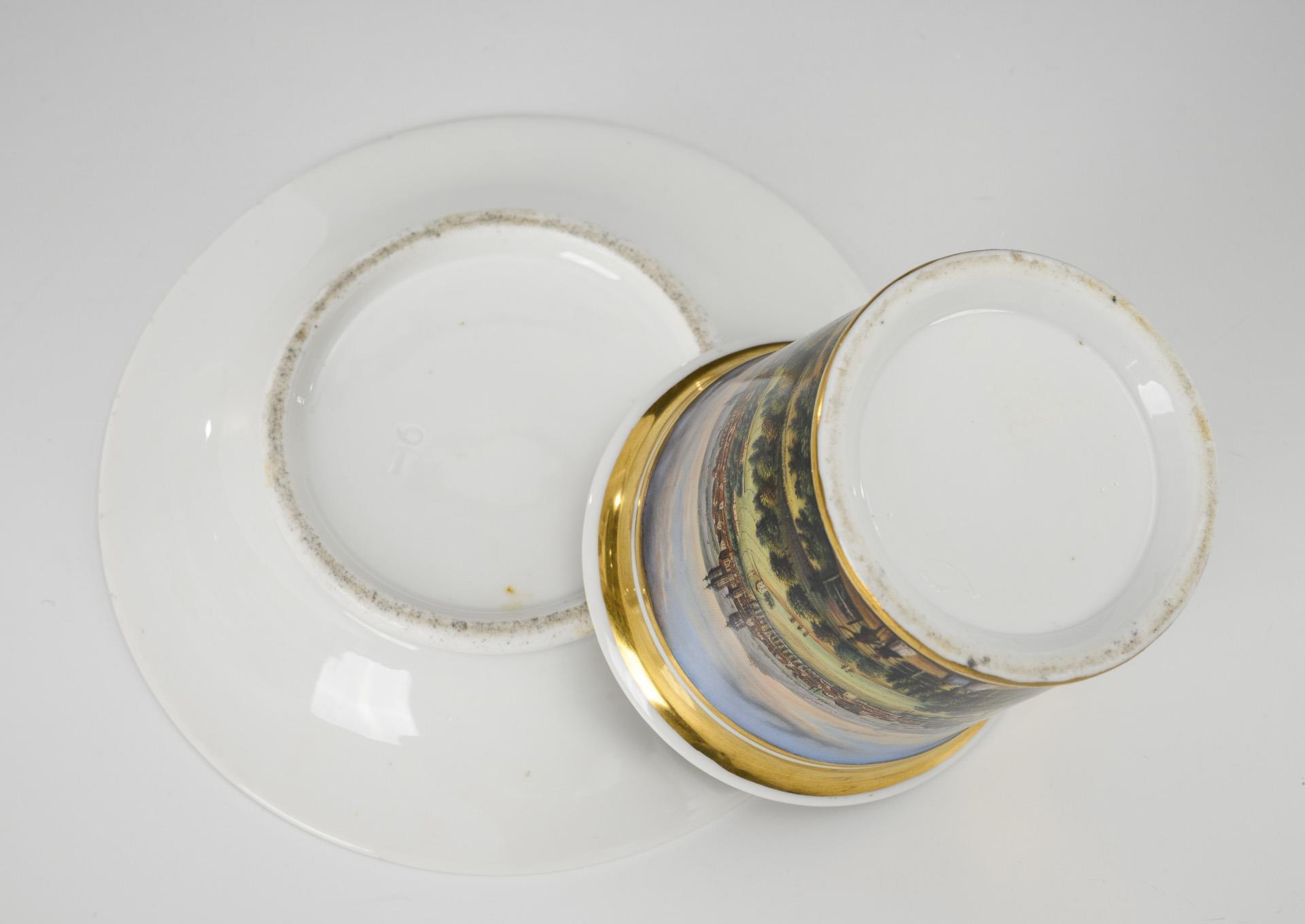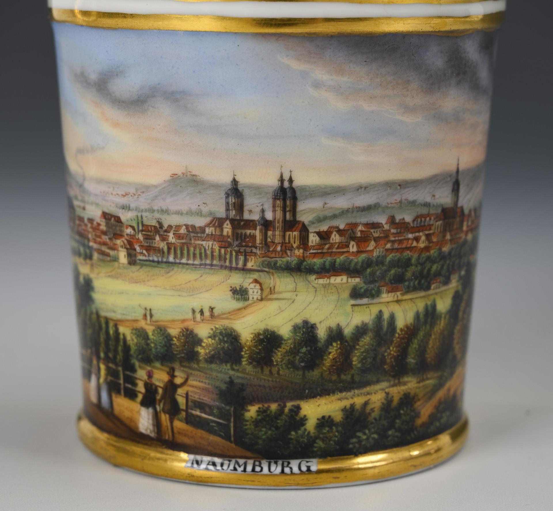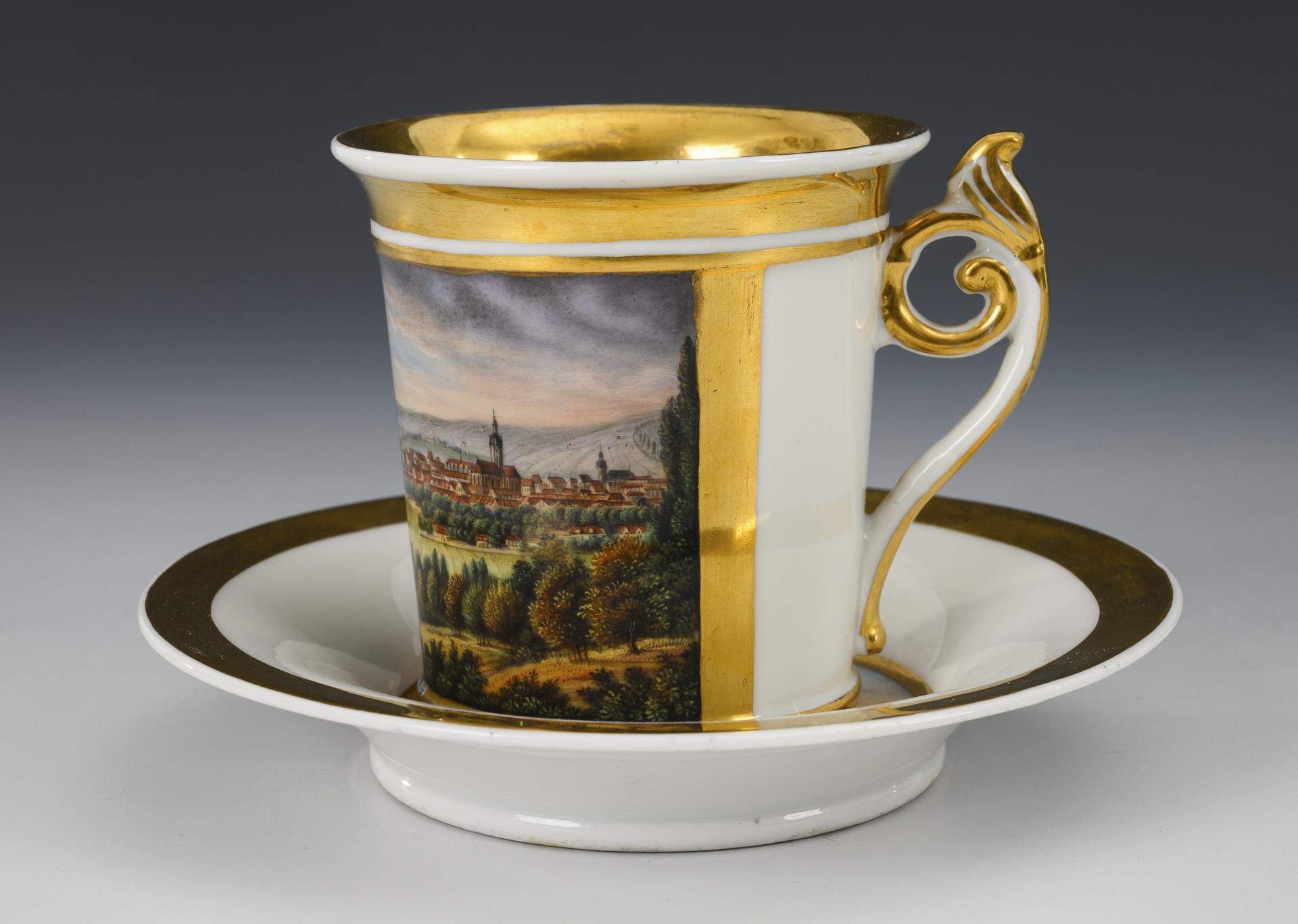 Cylindrical cup with crater rim and rocaille handle. On the front a gold-framed rectangular cartouche with the inscribed view of the city of Naumburg, in the mirror of the saucer a medallion with the view of St. Wenceslas Church in Naumburg and the date "den 10. Febr. 1850.".