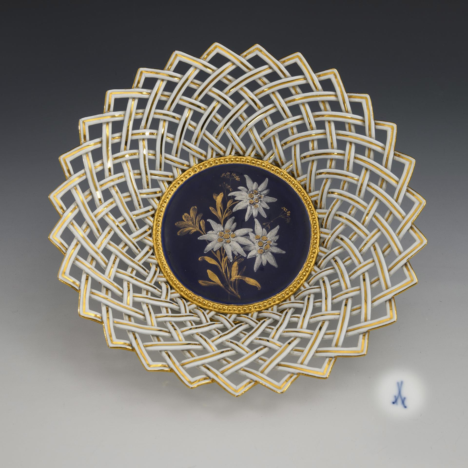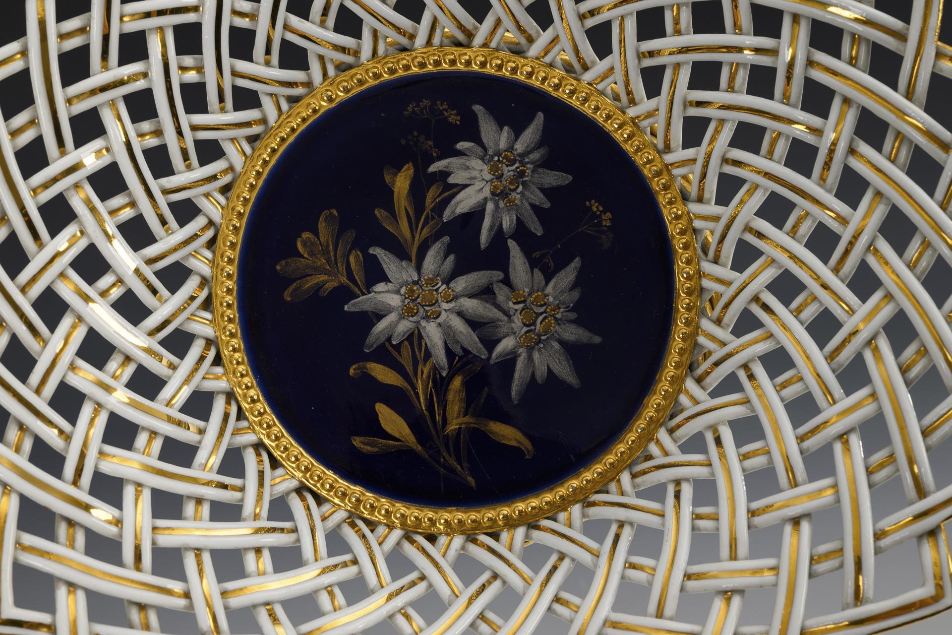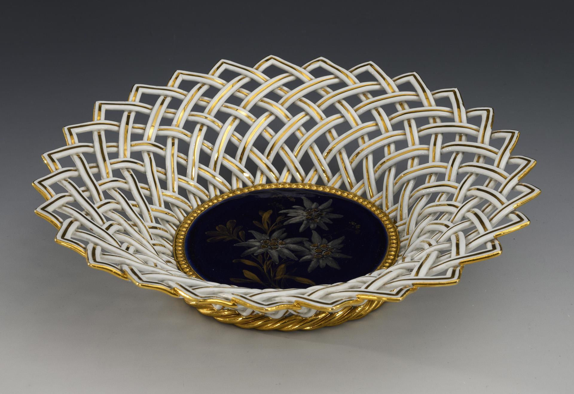 Wicker basket with serrated rim. In the mirror cobalt background with a silver and gold painted edelweiss.