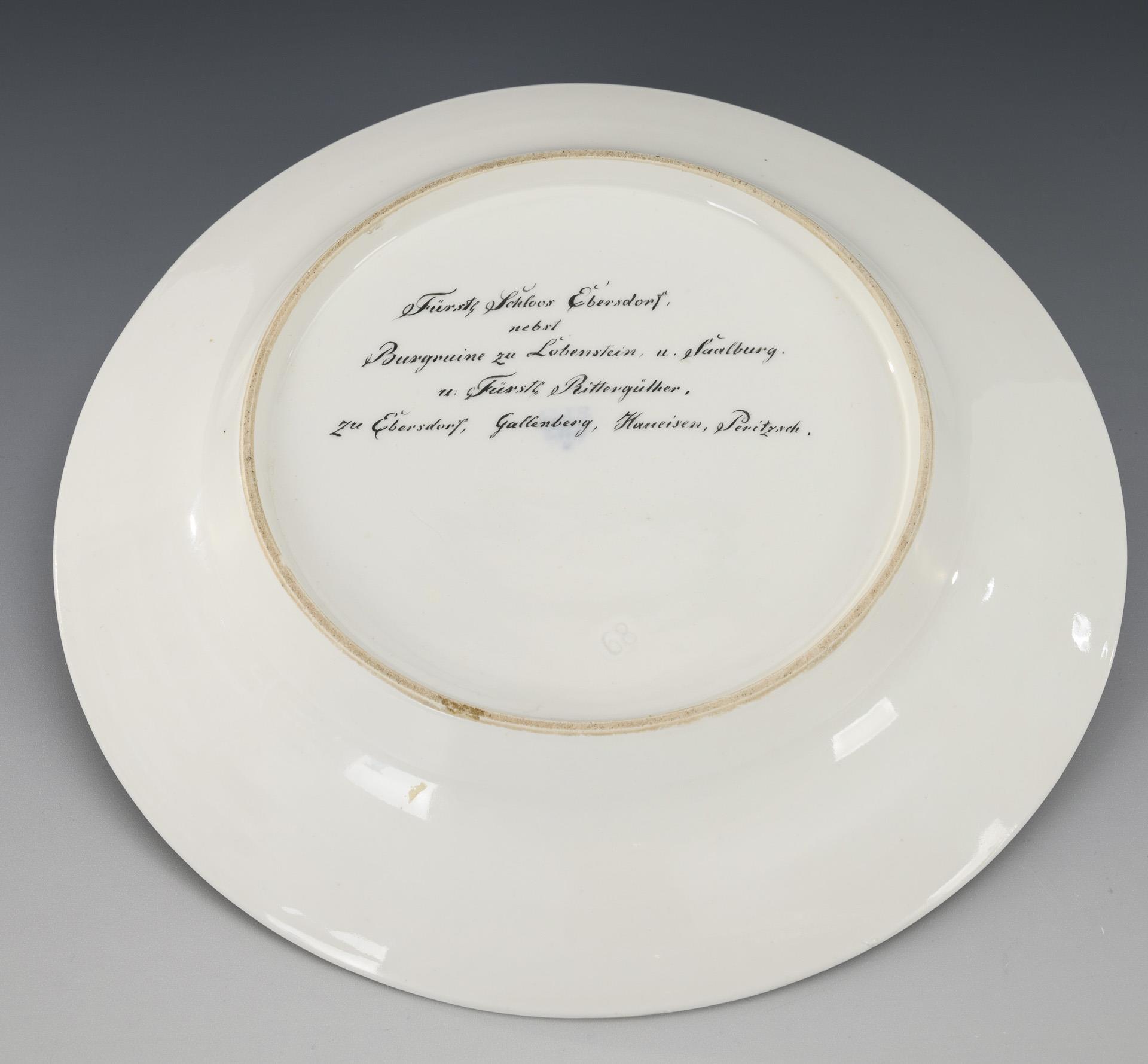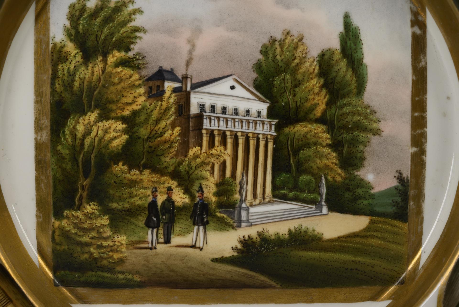 In the mirror a view of Ebersdorf Castle, on the banner six oval medallions with views of castles and estates of the Reuss family (Lobenstein castle ruins, Saalburg ruins, Ebersdorf, Gallenberg, Haueisen and Peritzsch manors). Minimal gold abrasion.