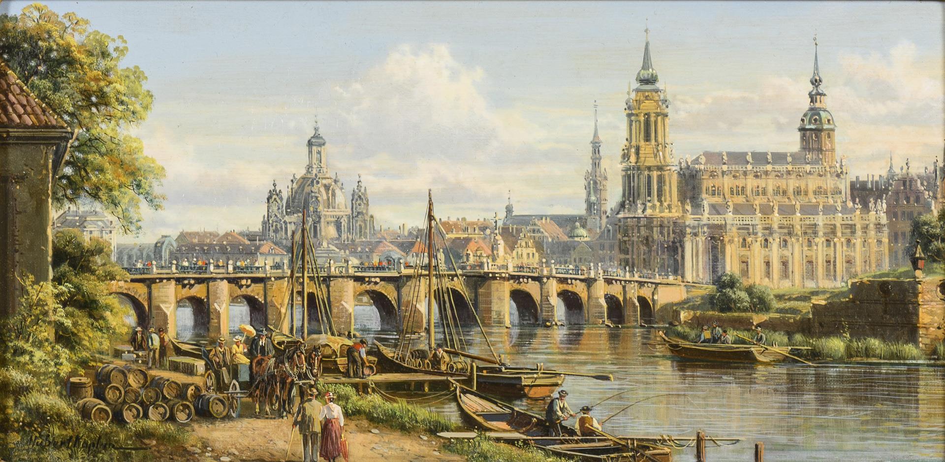 Finely painted panorama of Dresden's old town with detailed depiction of the architecture.
