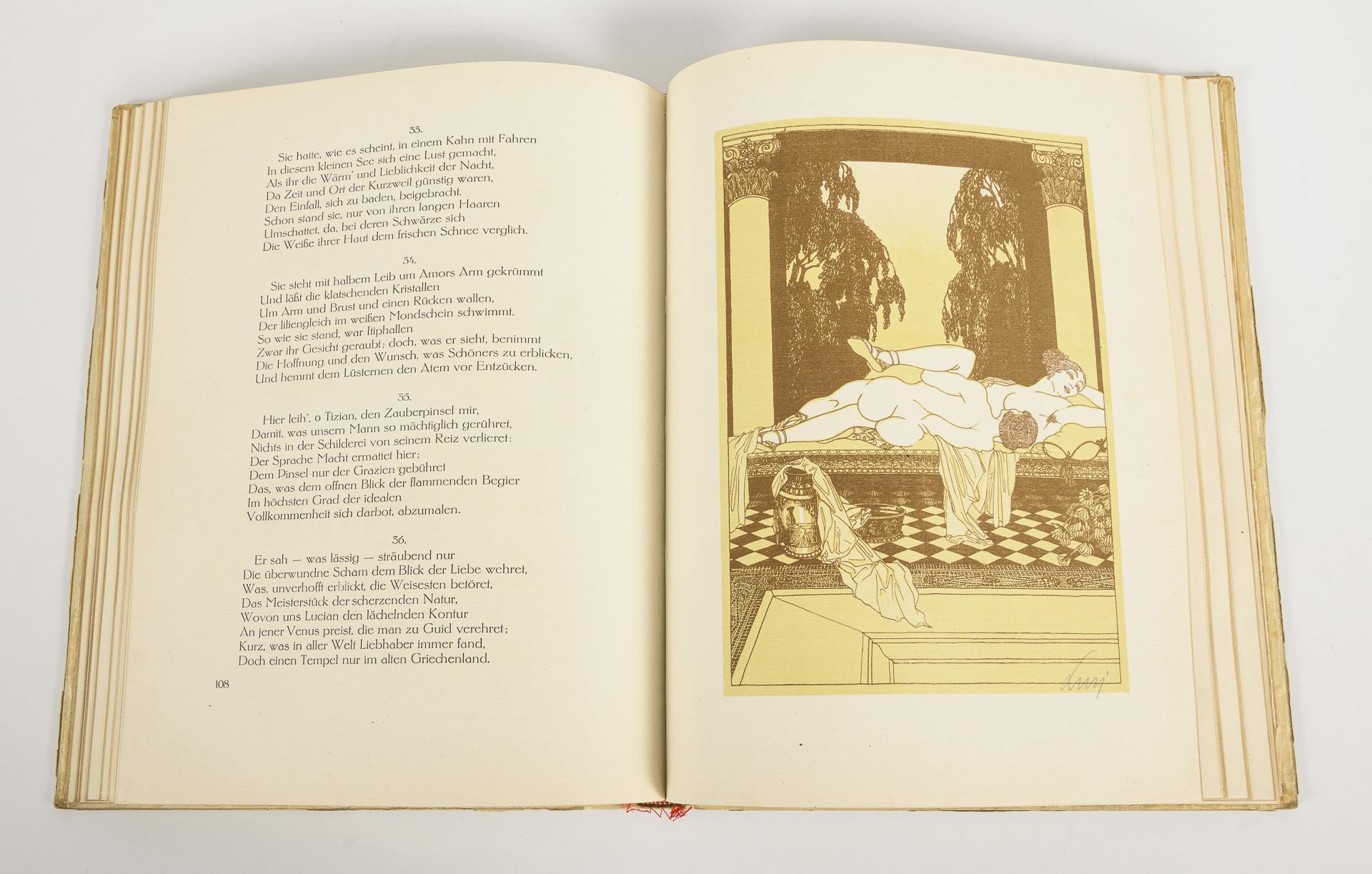 Erotic work. Numbered book, private print no. 8, without edition size. Dated 1767, but probably 20th century. 152 pages and 5 lithographs, hardcover with gilt edges. Spine somewhat torn, endpapers covered with silk cloth, somewhat damaged.