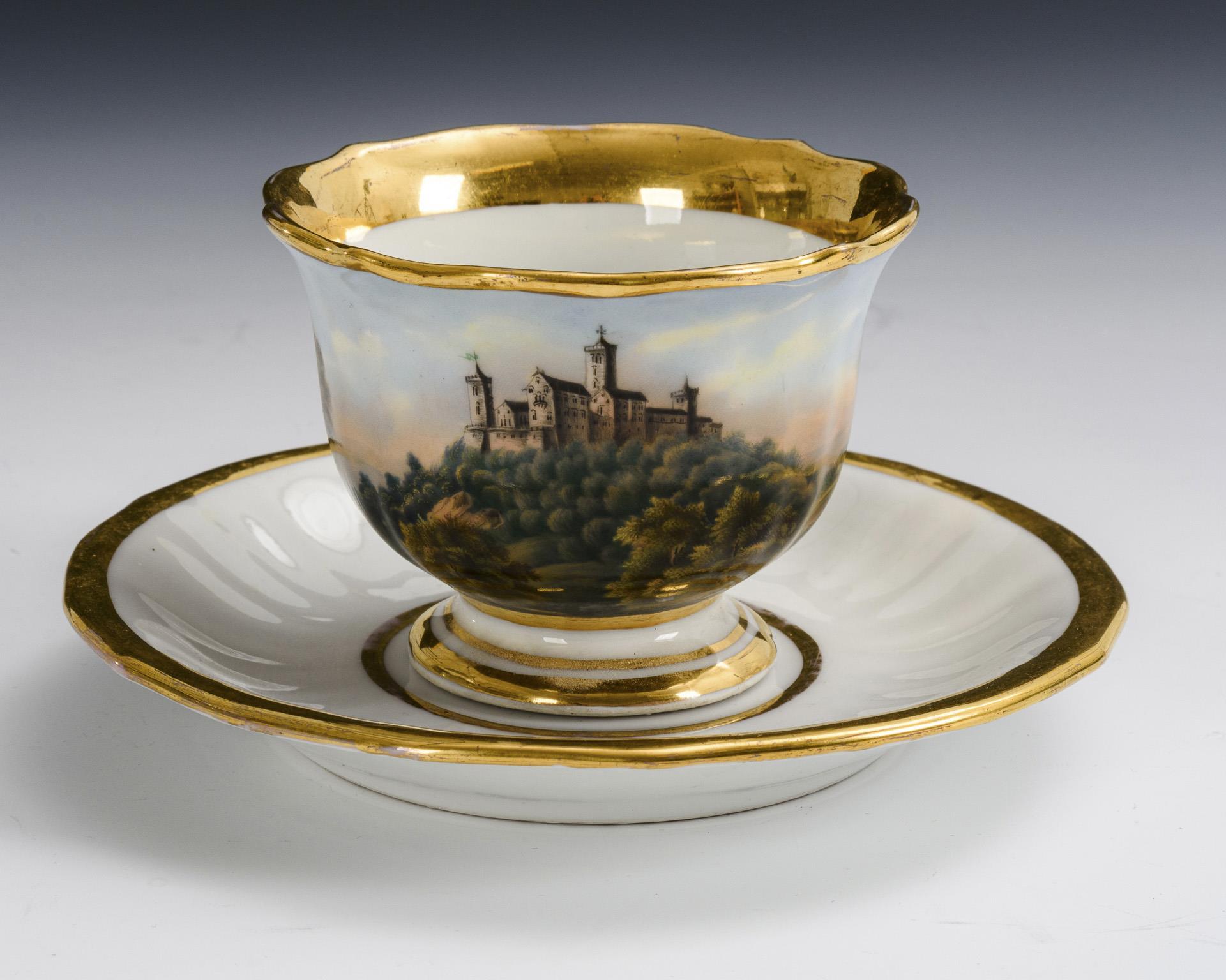 Footed, multi-pass cup with ear-shaped handle. On the front a gold-framed rectangular cartouche with a view of Wartburg Castle near Eisenach. Minimal gold abrasion to the saucer rim.