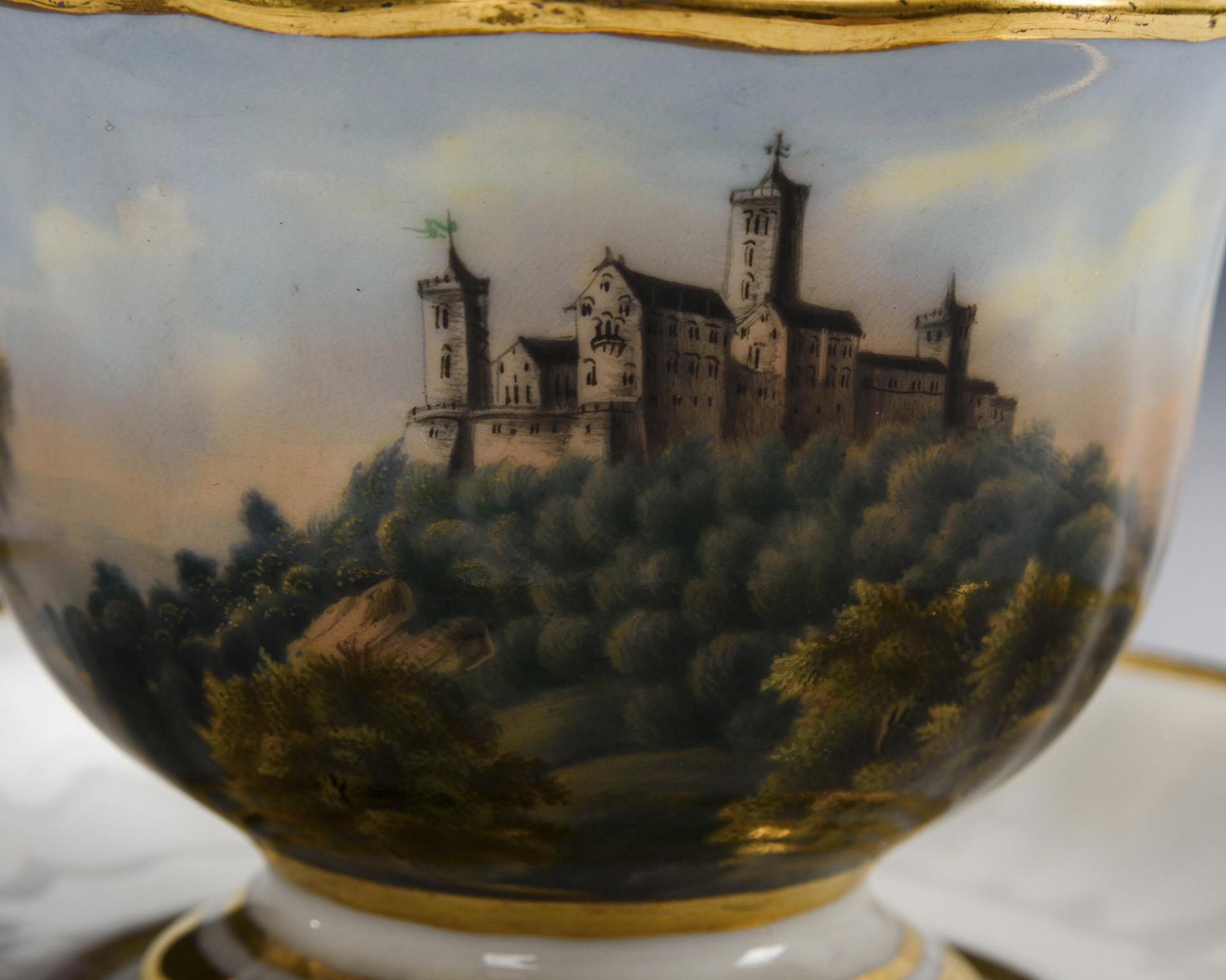 Footed, multi-pass cup with ear-shaped handle. On the front a gold-framed rectangular cartouche with a view of Wartburg Castle near Eisenach. Minimal gold abrasion to the saucer rim.