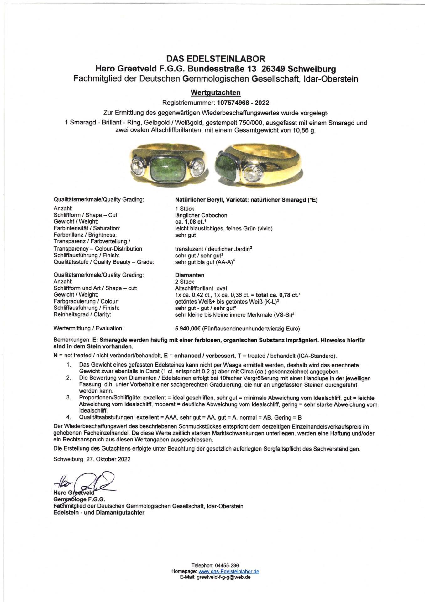 Yellow and white gold 750 stamped; the emerald approx. 1.08 ct (AA-A), the old-cut diamonds 1x approx. 0.42 ct, 1x approx. 0.36 ct, in total approx. 0.78 ct (K-L, VS-Si). Ring size 55. 10.9 g.