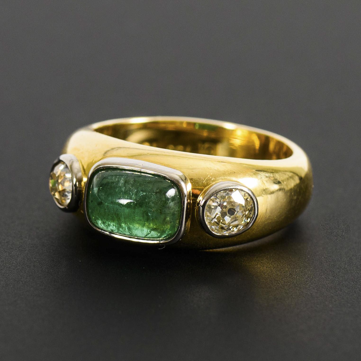 High-quality ring with an emerald cabochon and 2 old-cut diamonds in a wide ring band.