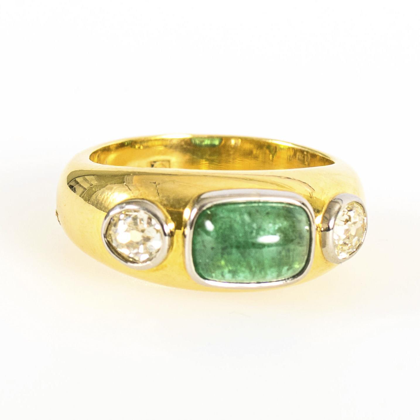 Ring with emerald cabochon and two diamonds.