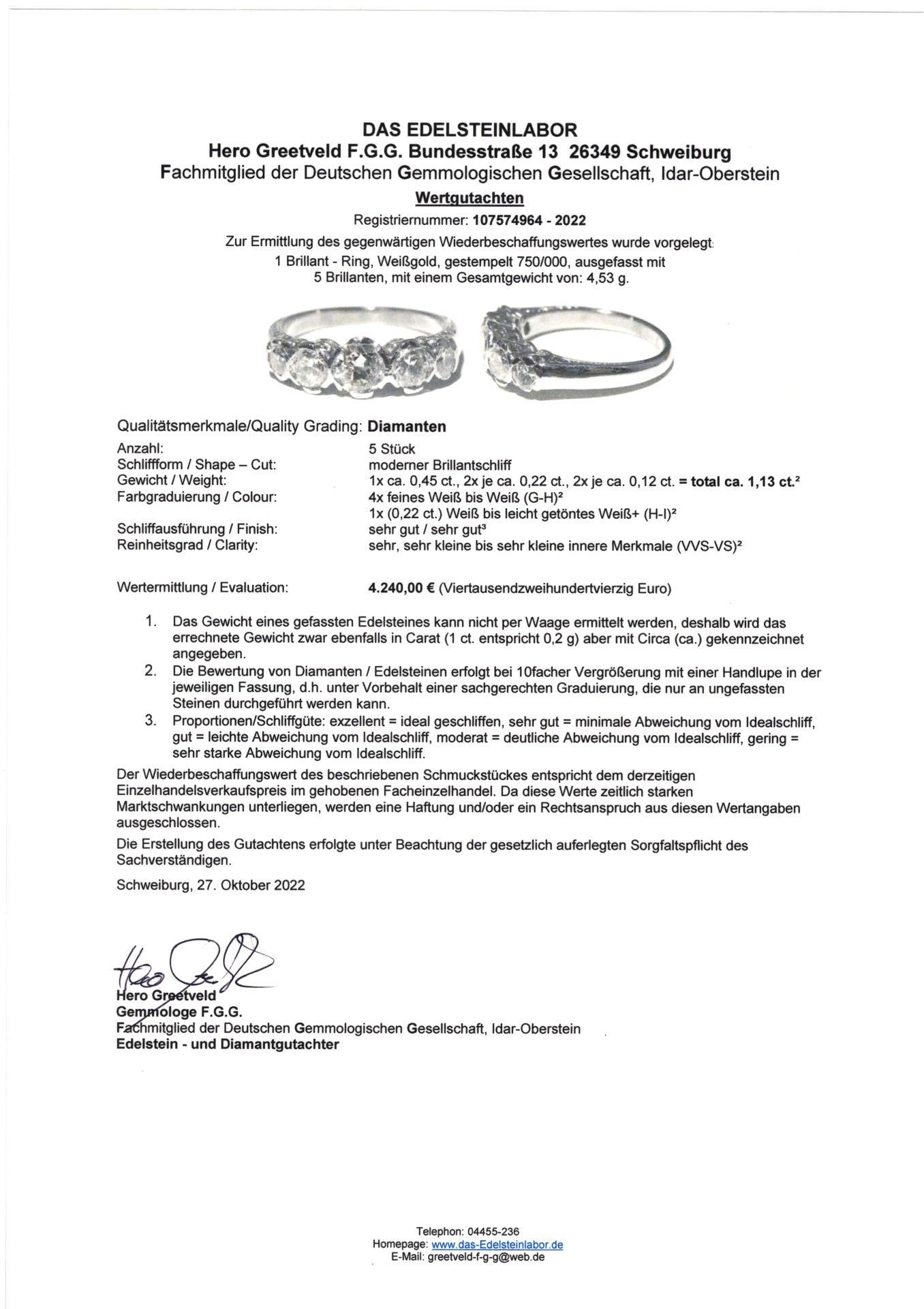 Classic, high-quality crafted white gold ring, set with 5 brilliant-cut diamonds.