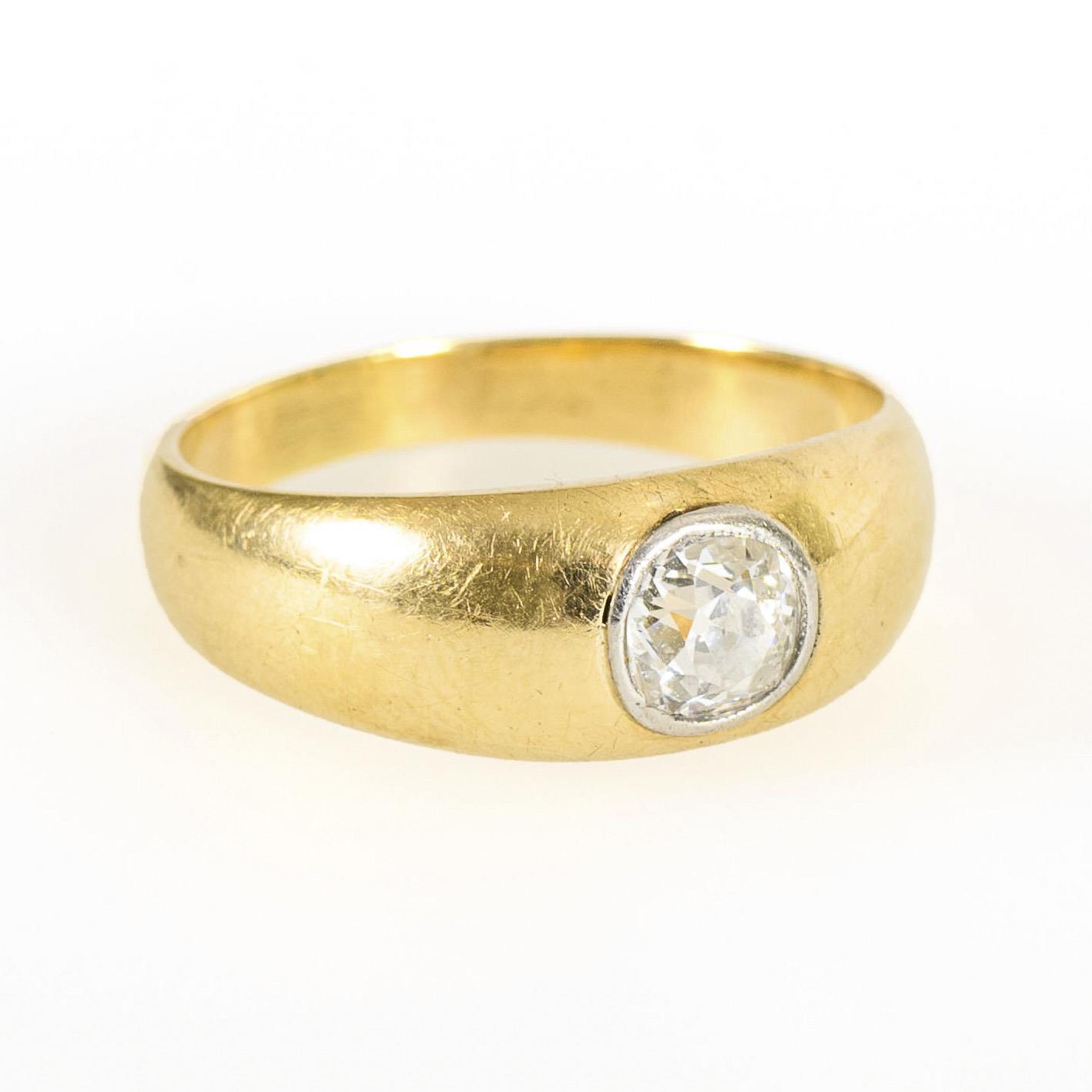 Classic brilliant-cut diamond solitaire in a wide yellow gold band. Slight signs of wear.