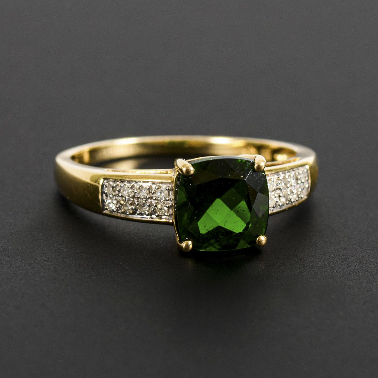 Marked yellow gold 585. Diopside approx. 1.90 ct. Diamonds 8/8 together approx. 0.05 ct. Ring size 59. 2.8 g.