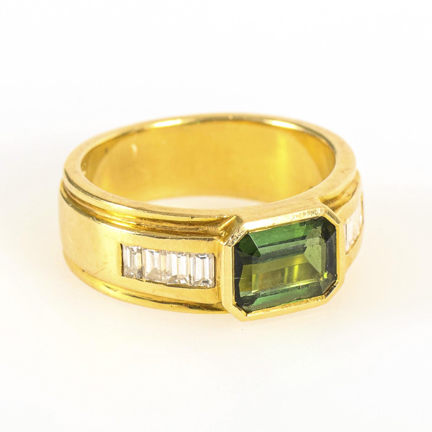 Ring with baguette-cut tourmaline and diamonds. Wide shank. Slight signs of wear on the underside.