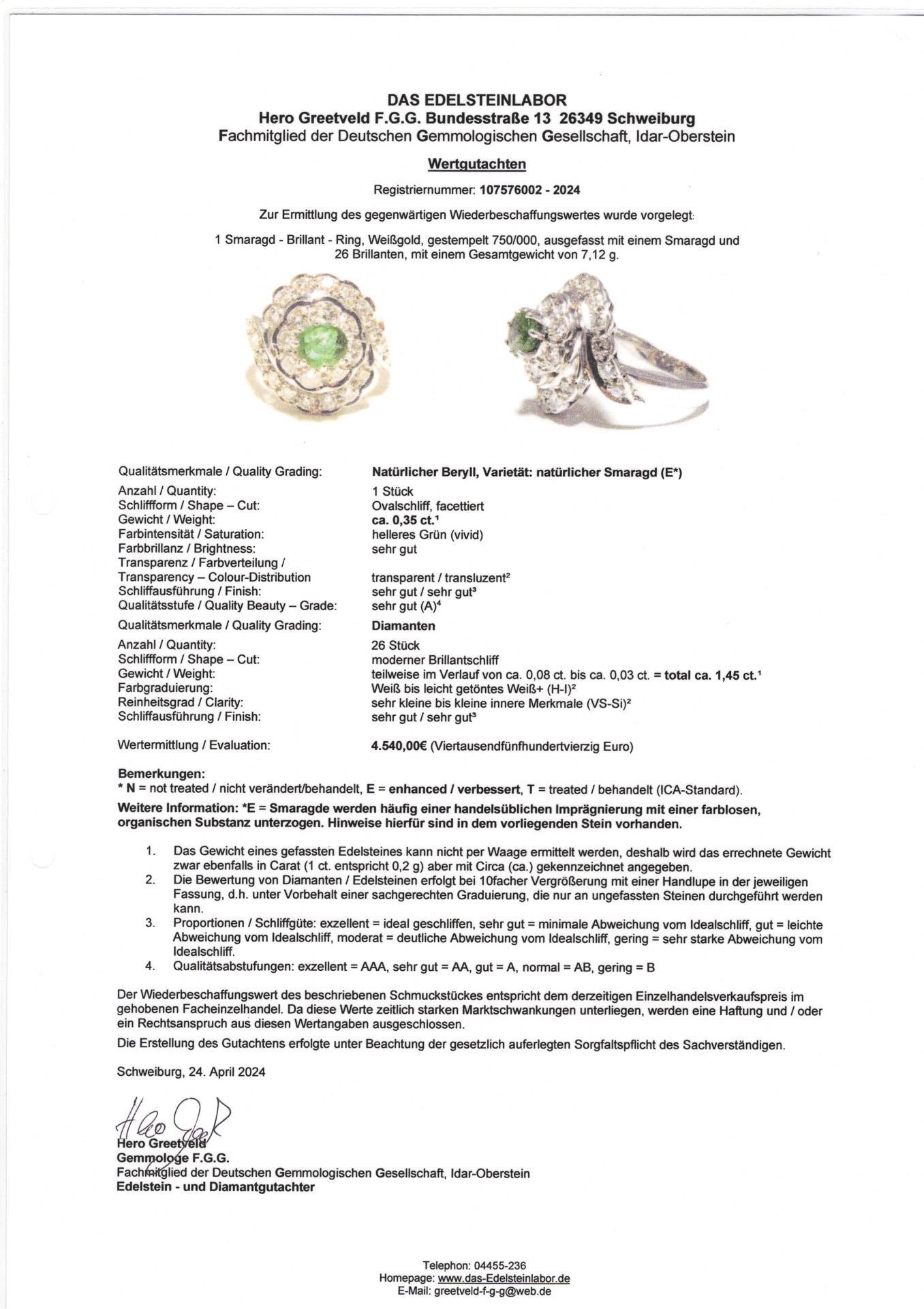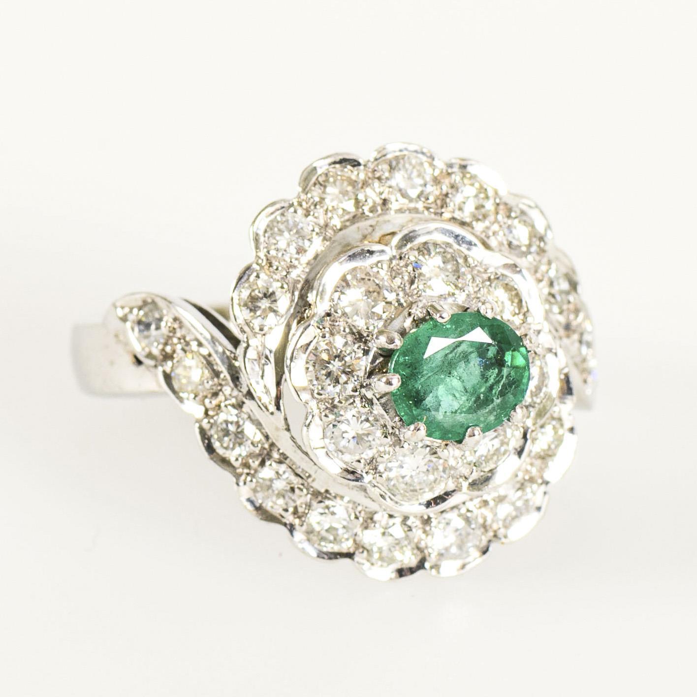 Stamped 750 white gold. Emerald approx. 0.35 ct. Diamonds together approx. 1.45 ct/H-I/vs-si. Ring size 54. 7.2 g.