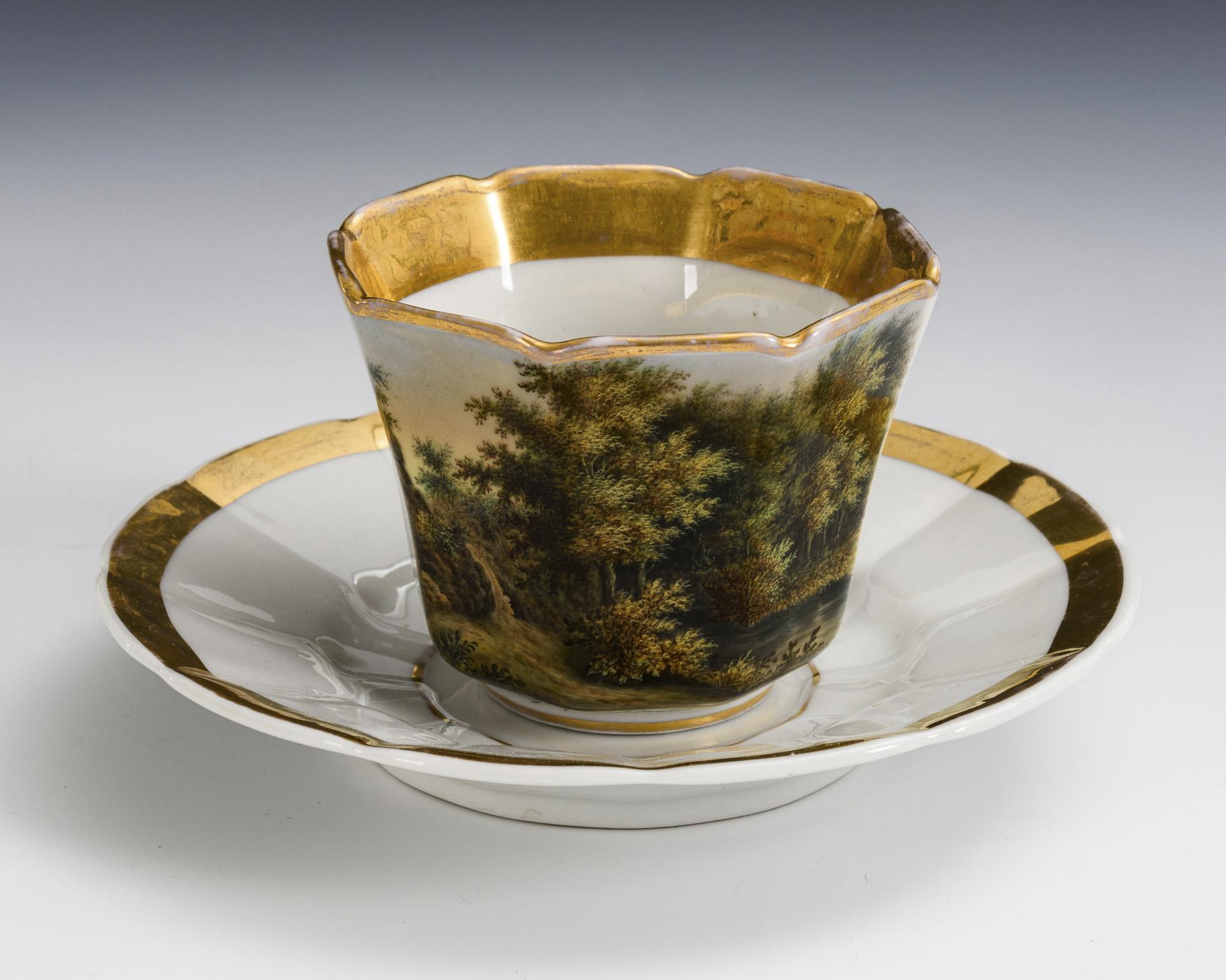 Polygonal-conical cup with tapering handle. Inscribed depiction of the Landgrave Gorge near Eisenach on the front. Gold somewhat rubbed.