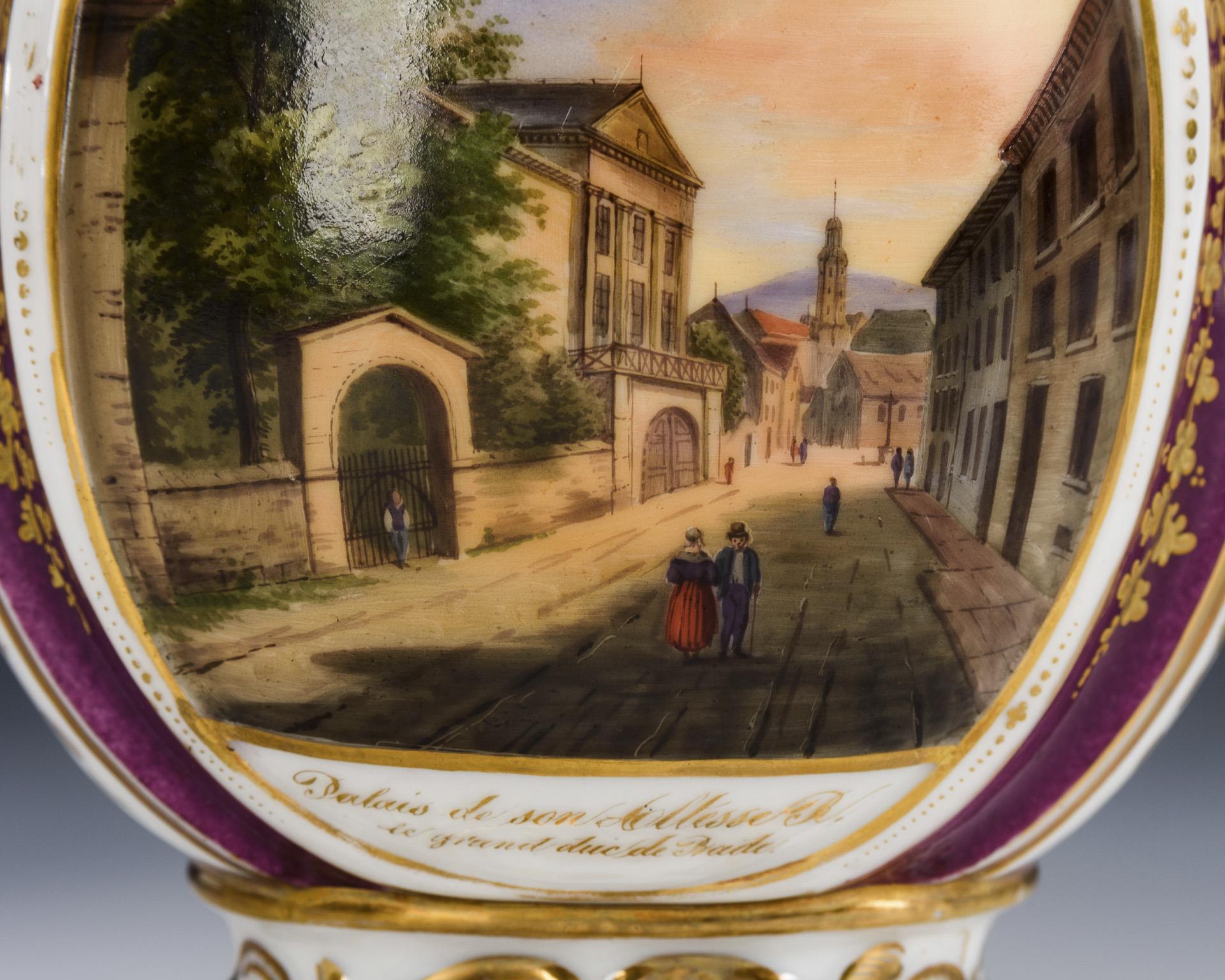 Pear vase with two small handles, leaf rim and rocaille-relief foot. On the front an oval cartouche with the French inscribed view of the palace of the Grand Duke of Baden, the so-called Villa Hamilton, after a lithograph by W. Scheuchzer, 1838; verso a bouquet of flowers. Partial gold abrasion, wear to the stand, handle tips worn.