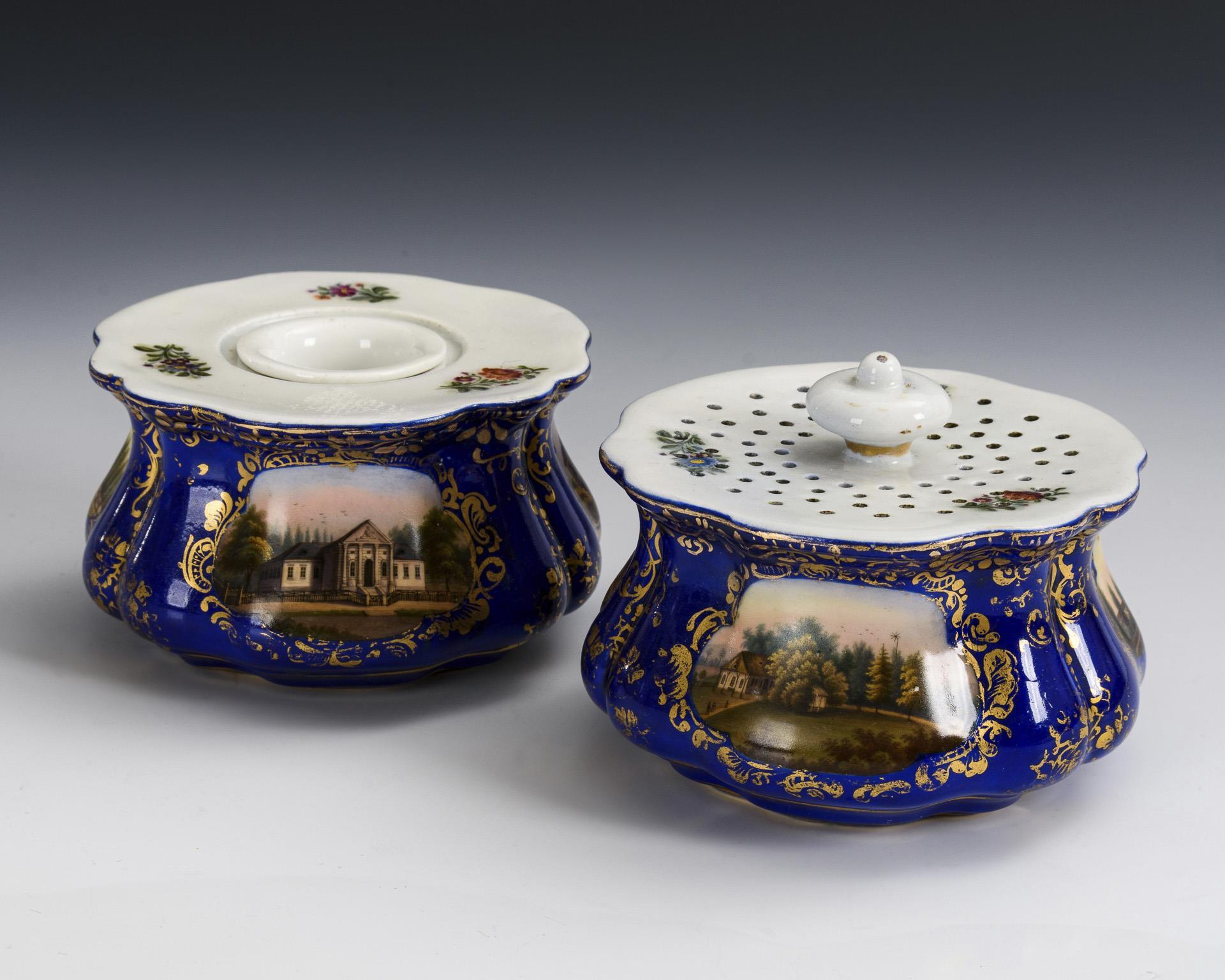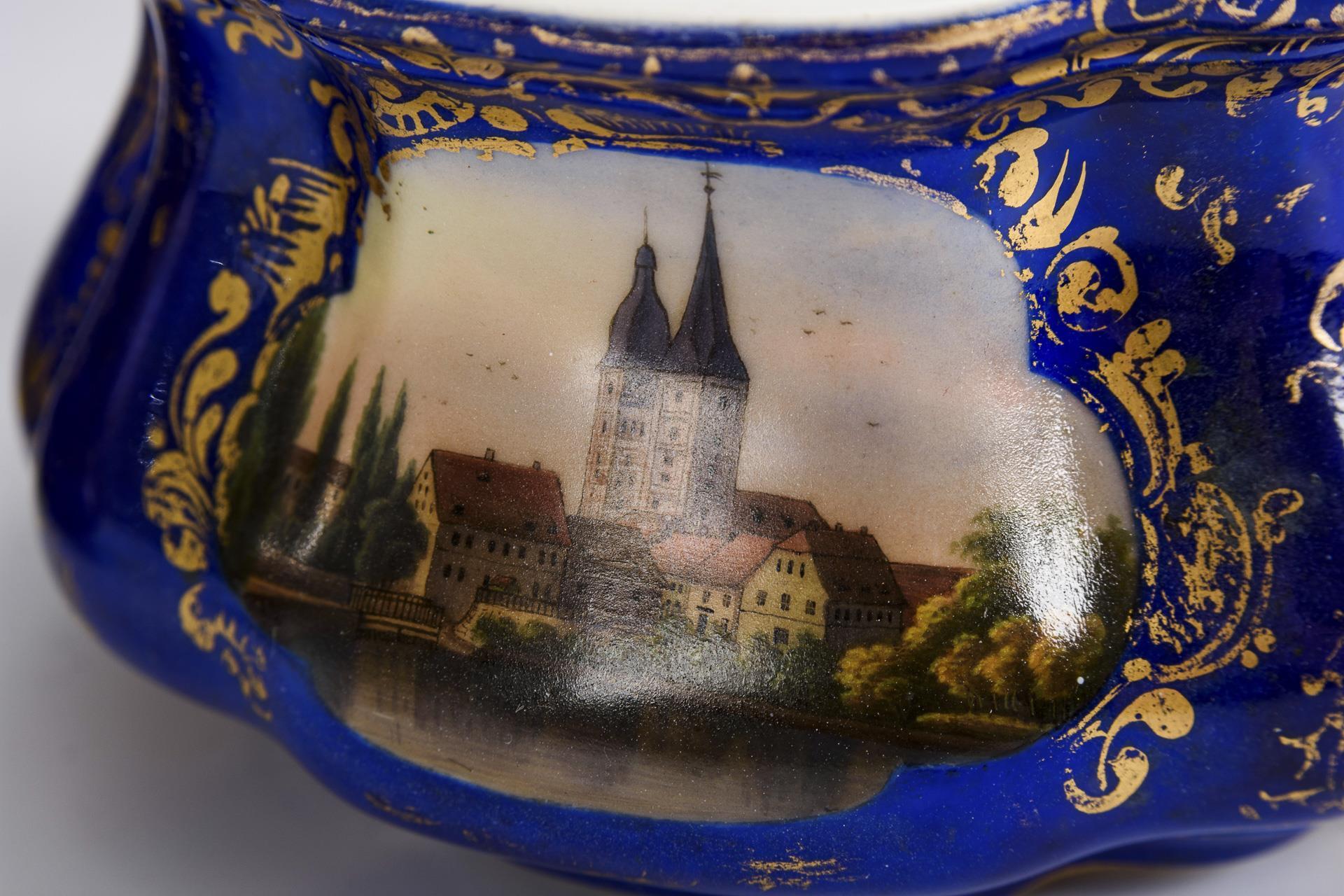 Multi-pass, molded vessels with a blue, richly gold-painted base. Three quatrefoil cartouches on each wall with views of Altenburg (including the Masonic Lodge, the Schützenhaus, the casino, the rich hospital [= Hospital zum Heiligen Geist], the red lace). Inkwell without lid, both restored.