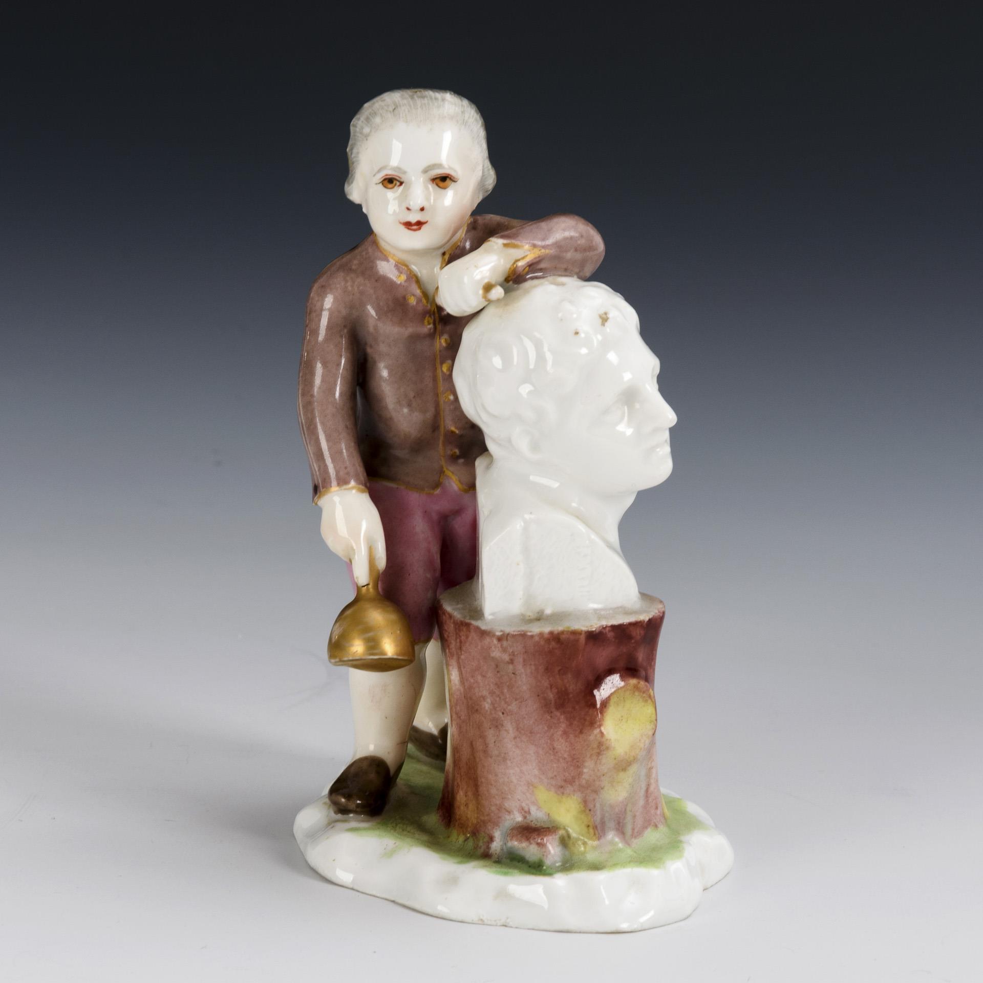 Boy standing at a bust with chisel and mallet. Chisel chipped.