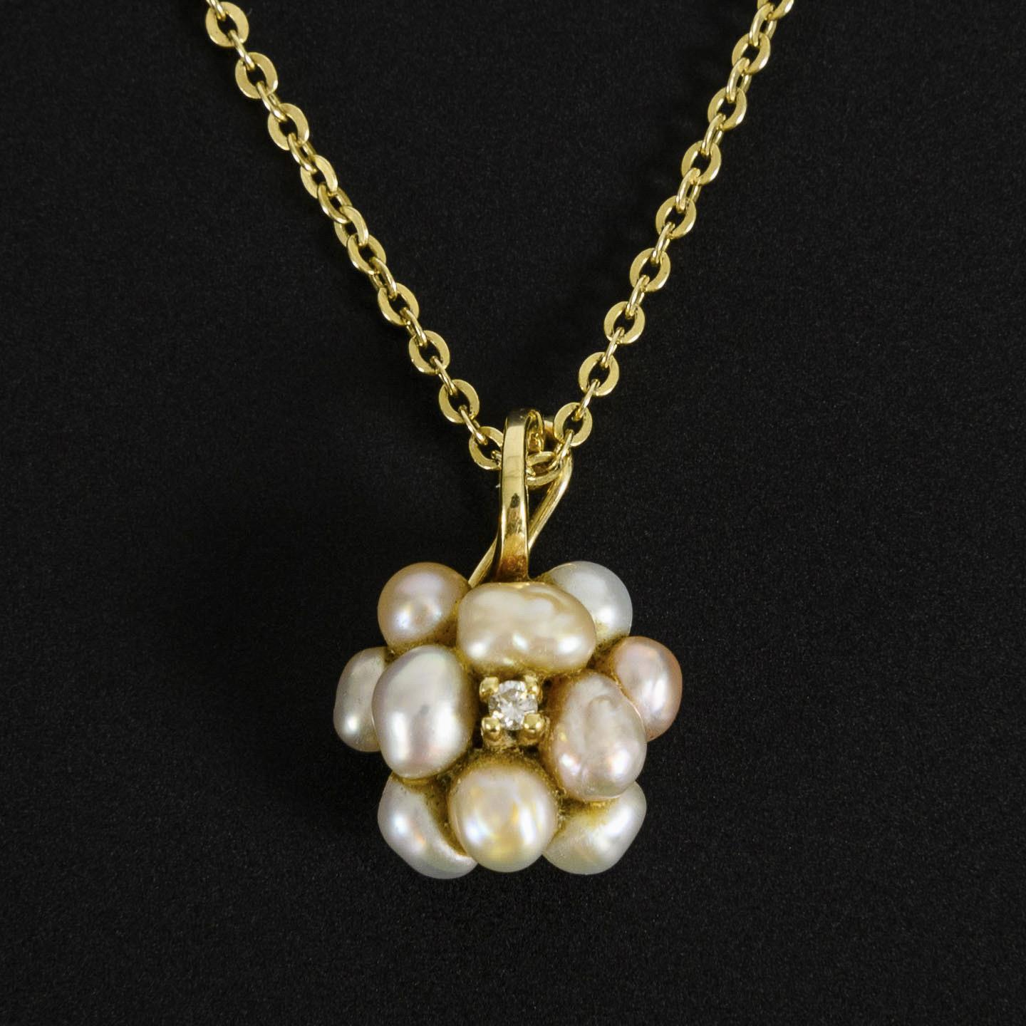 Pendant with small, baroque pearls and central, small brilliant-cut diamond, on anchor chain with ring spring clasp.