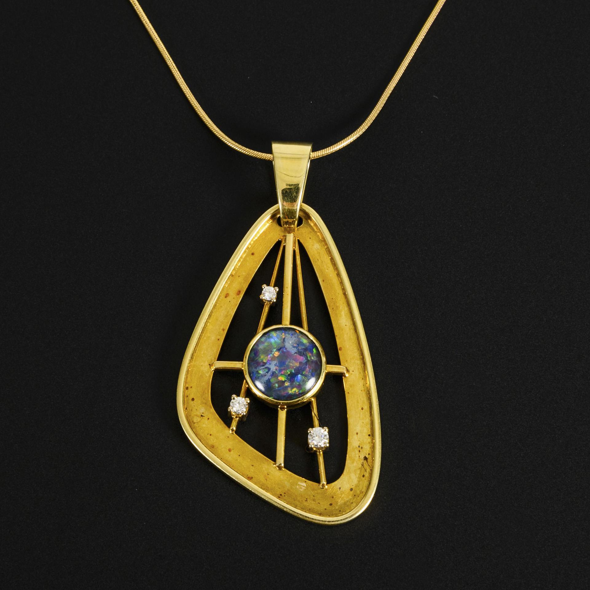 Large pendant with opal triplet and diamonds, on a necklace.