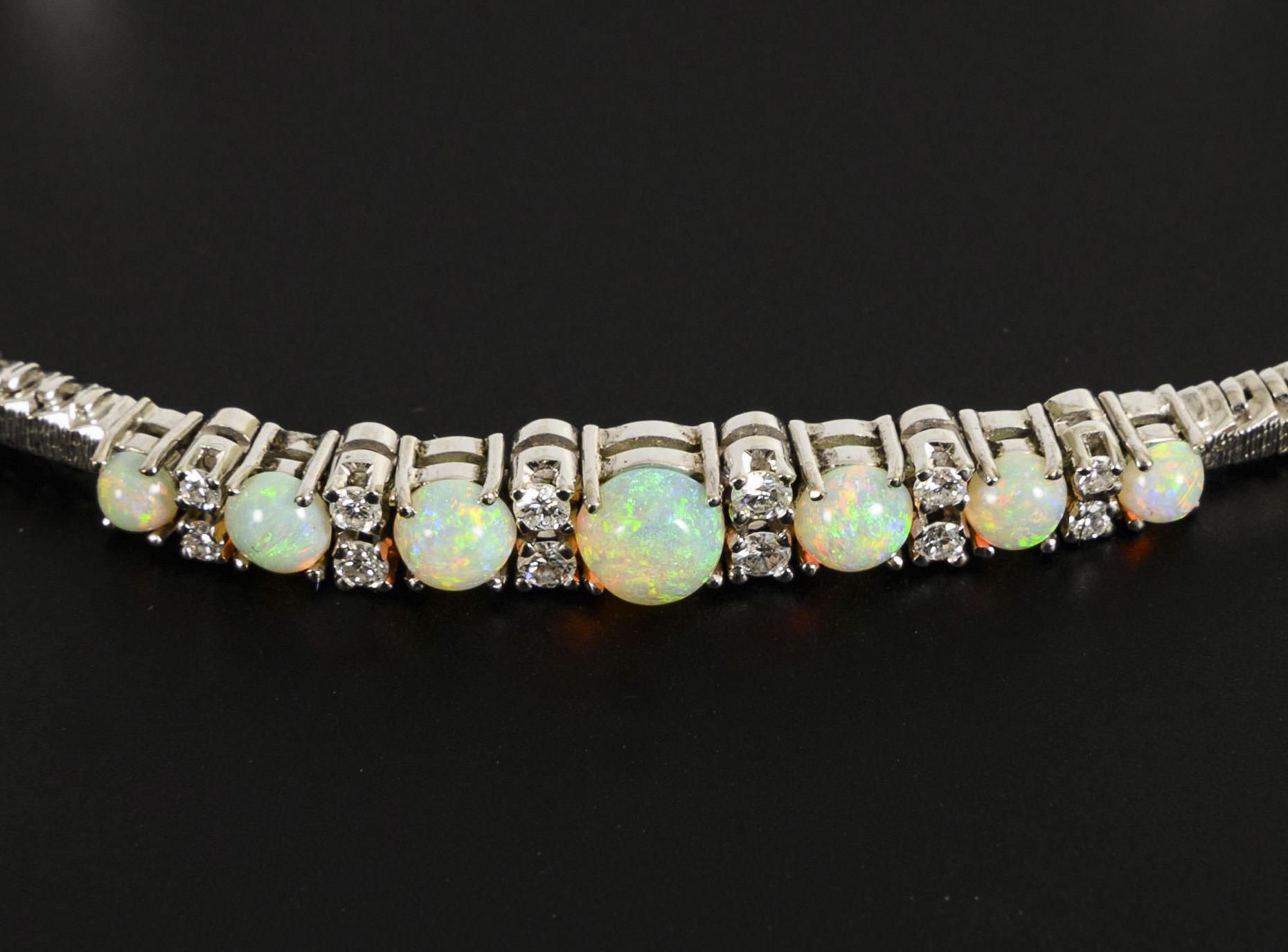 Bracelet with chaton-set round opal cabochons and brilliant-cut diamonds. Box lock with figure-of-eight safety catch.