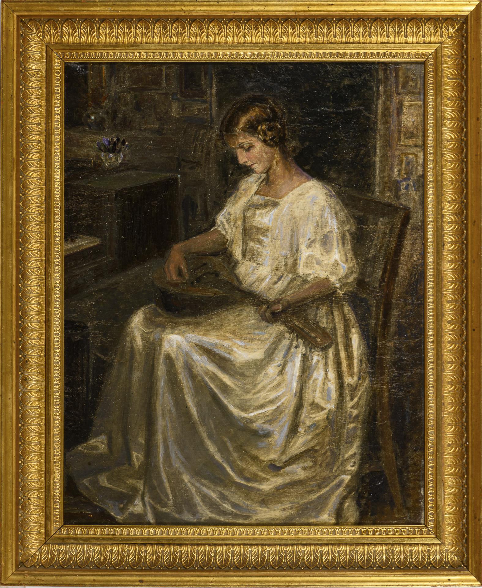 The young woman in a white dress with the instrument on her lap in the room. Doubled canvas.