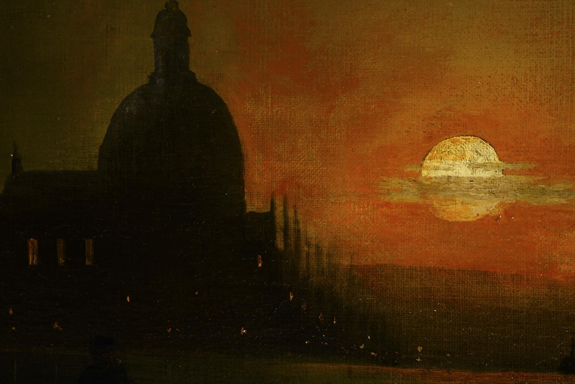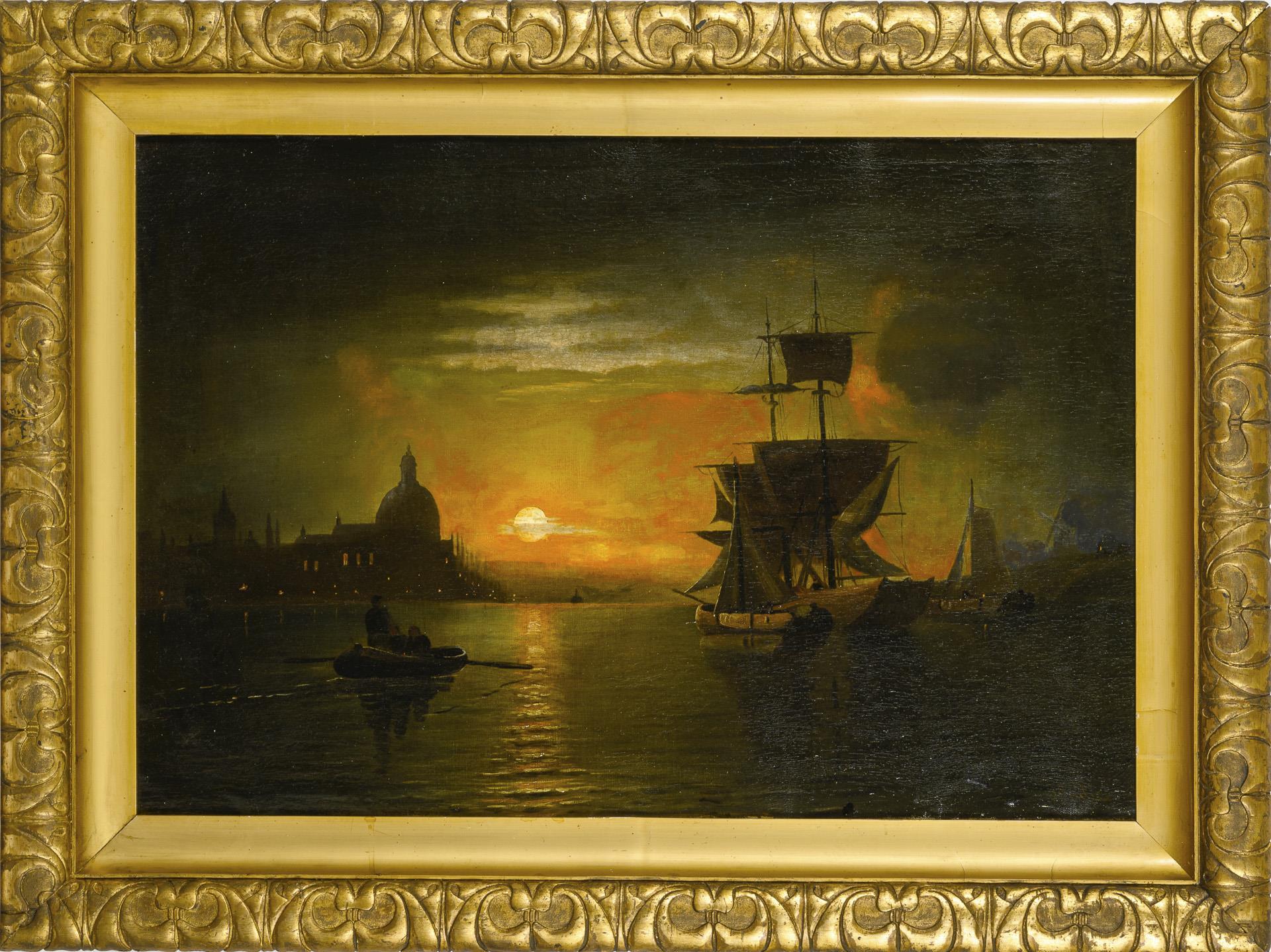 Ships at full moon in front of the silhouette of the city with illuminated houses. Two small restored areas with adhesive backing.