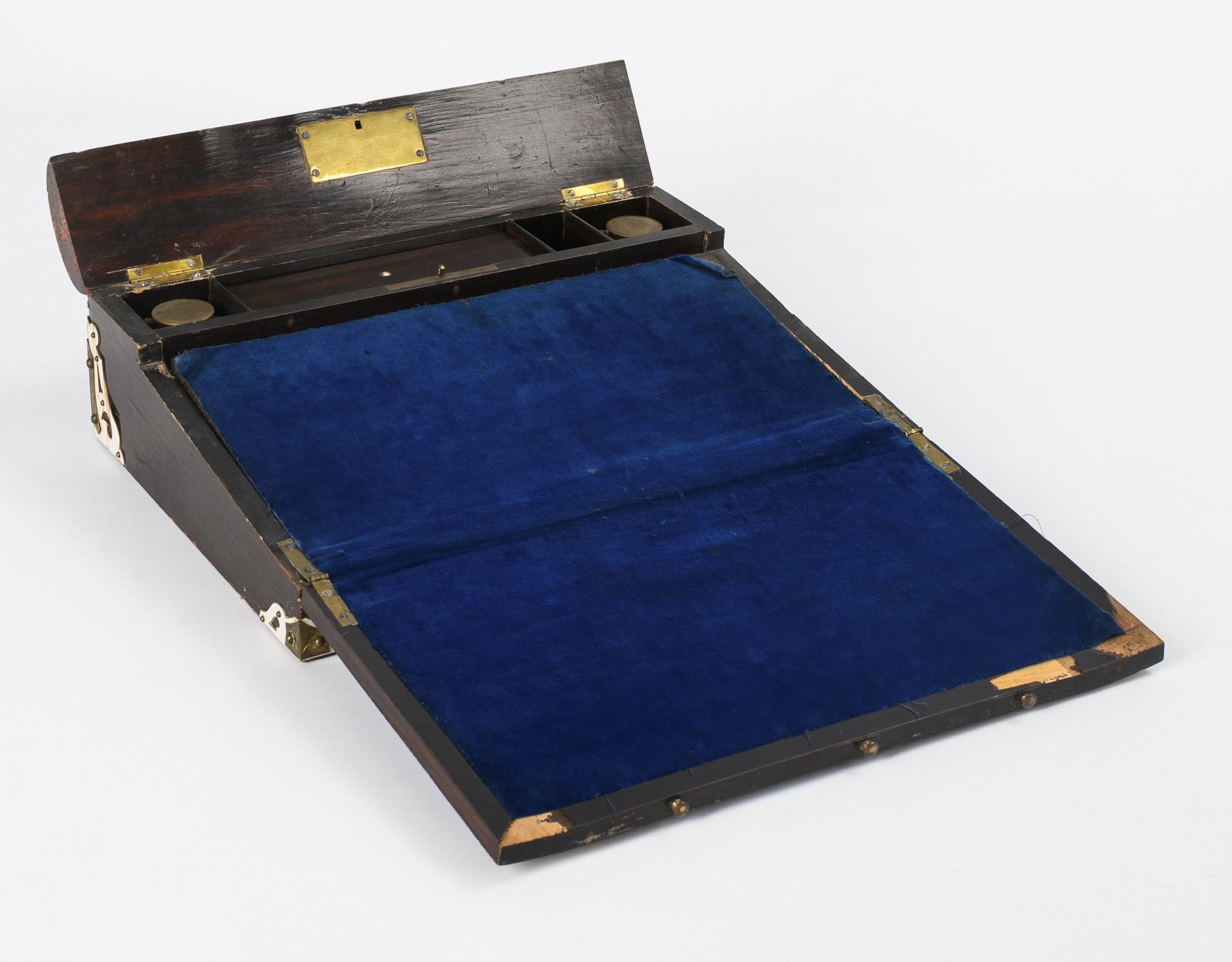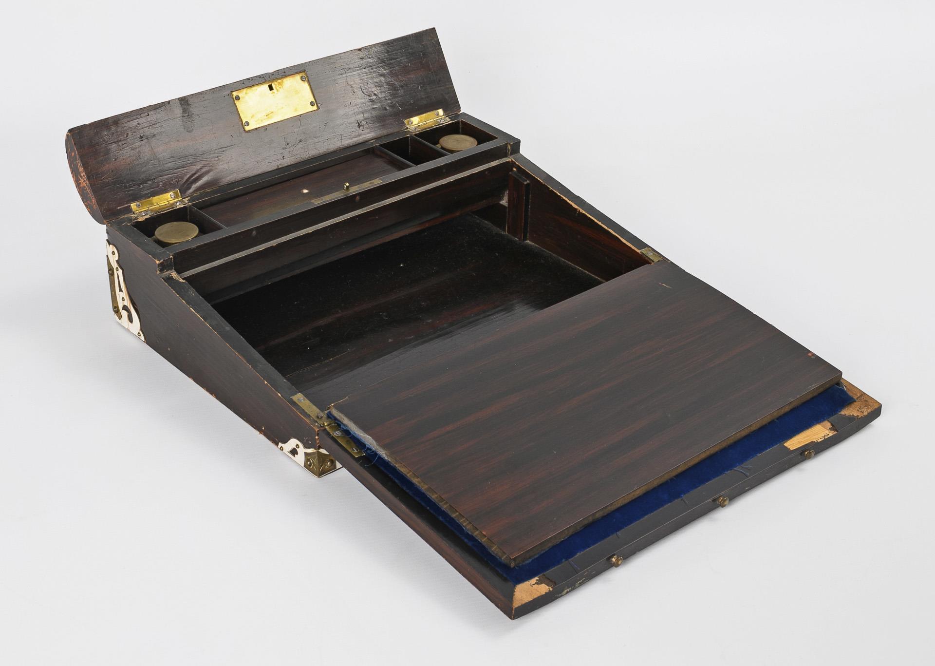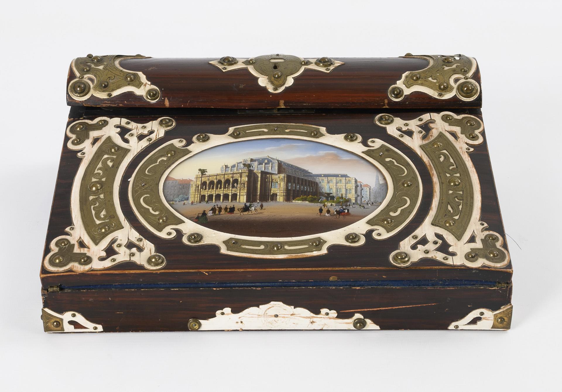 Sloping desk box, richly decorated with ornamental appliqués; view of the opera with passers-by on the hinged lid. Inside, slanted writing surface, covered with blue felt, above compartments for the two brass containers (inkwell and litter box) as well as various compartments. In need of restoration.