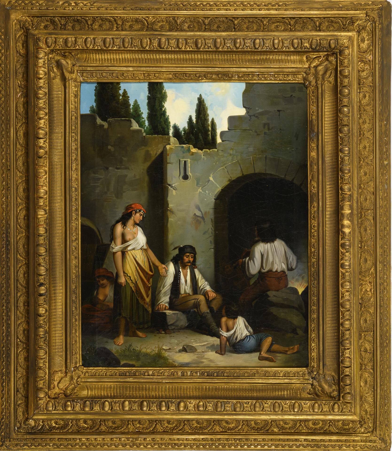 Genre scene with several people at the entrance to a ruin, in the sunshine. Slight traces of age.